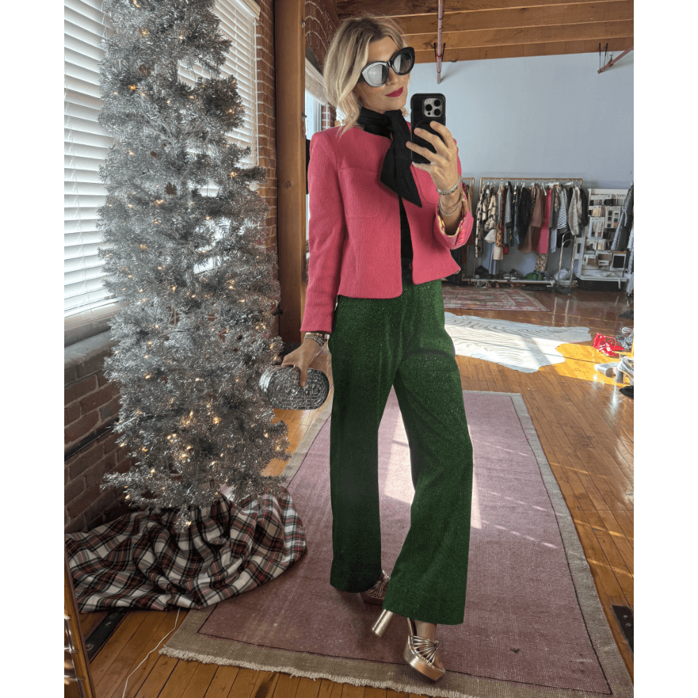 A quick addition of non-holiday color extends the wear of these Le Culottes beyond the Holiday Season. Paired with our Black Sheer Bow Blouse and Bubblegum Knit blazer, this look is perfect for a celebratory brunch anytime of year.