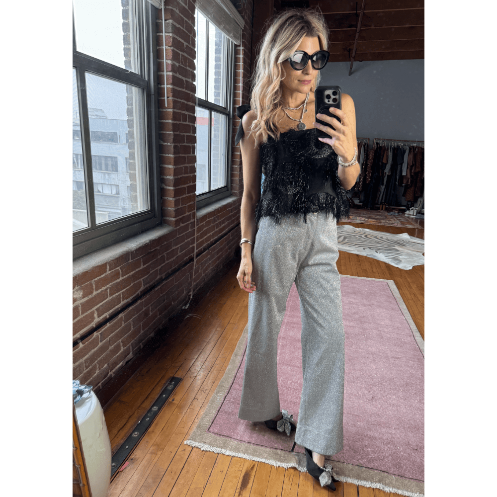 Since introducing our Le Culottes in 2023 we've fallen in love with the fit and versatility of the silhouette. In fact, we are so in love, we decided to introduce them as a full-length pant! So... while they aren't technically a culotte, we kept the name intact to make sure it was obvious that the fit was the same with just added length. The same elastic back waist, flat front and pockets that you love, just now in a full-length style. And this silver sparkle textile is everything! Attending a cocktail event and wanting to stay comfortable? This look is for you!