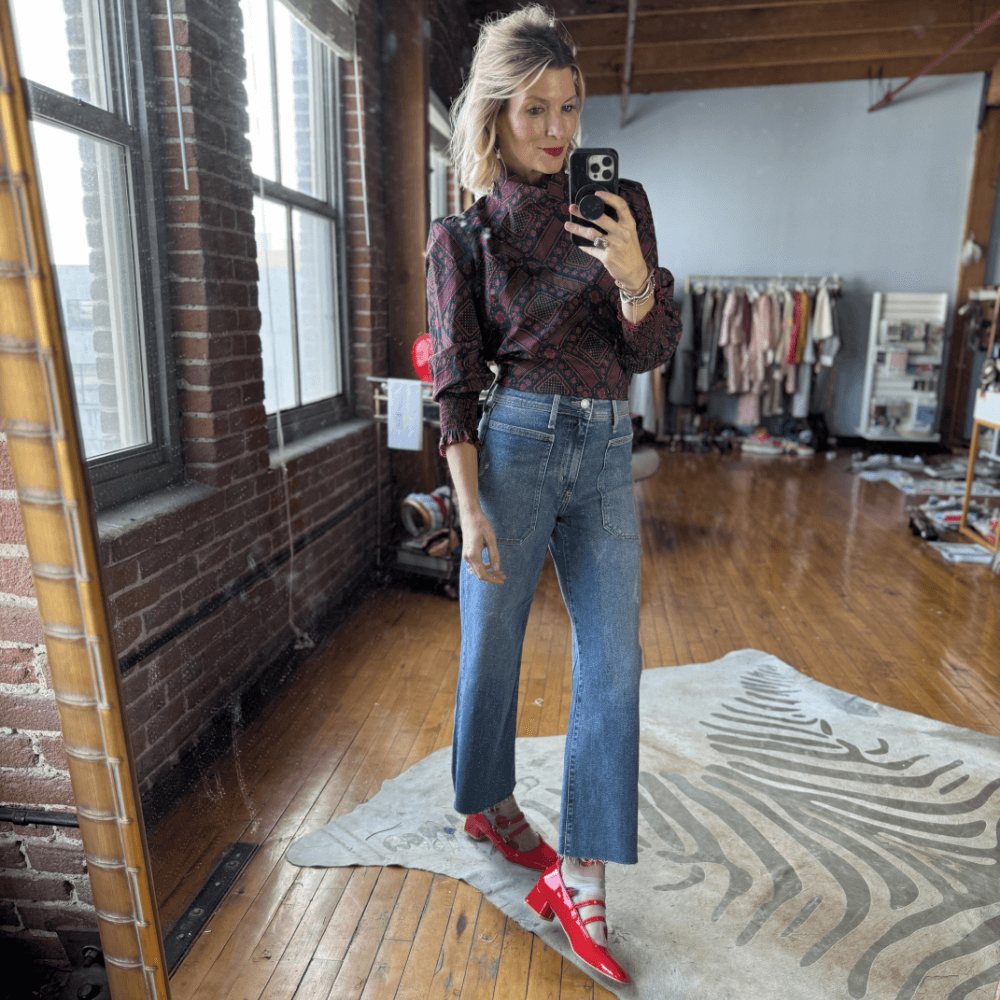 Adding the Strawberry Sheer Socks under your favorite pair of jeans creates a fun peek-a-boo accent to an otherwise typical ensemble. We love how the red of the shoes and strawberries pulls from the wine color of our Indigo Floral print Mod Top (one of our favorite prints!).