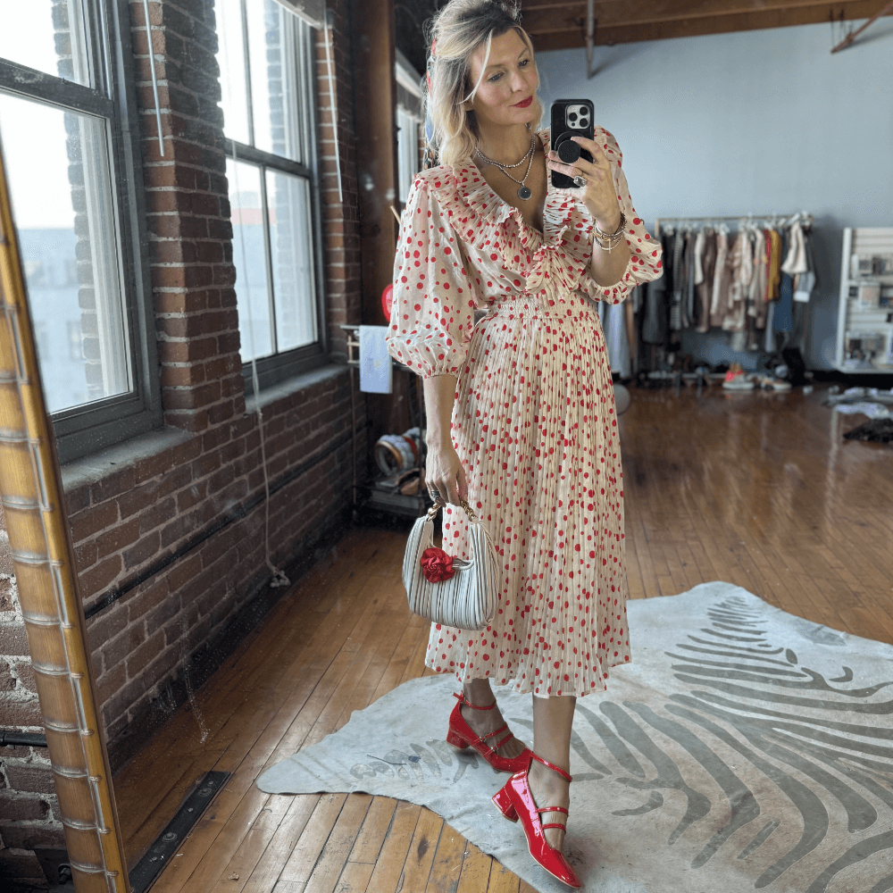 The red patent coloring of the favored shoe style is a stunning complement to the Flocking Dot Collection. Comfortable enough for all day wear and chic when styled with the Blanche Dress.