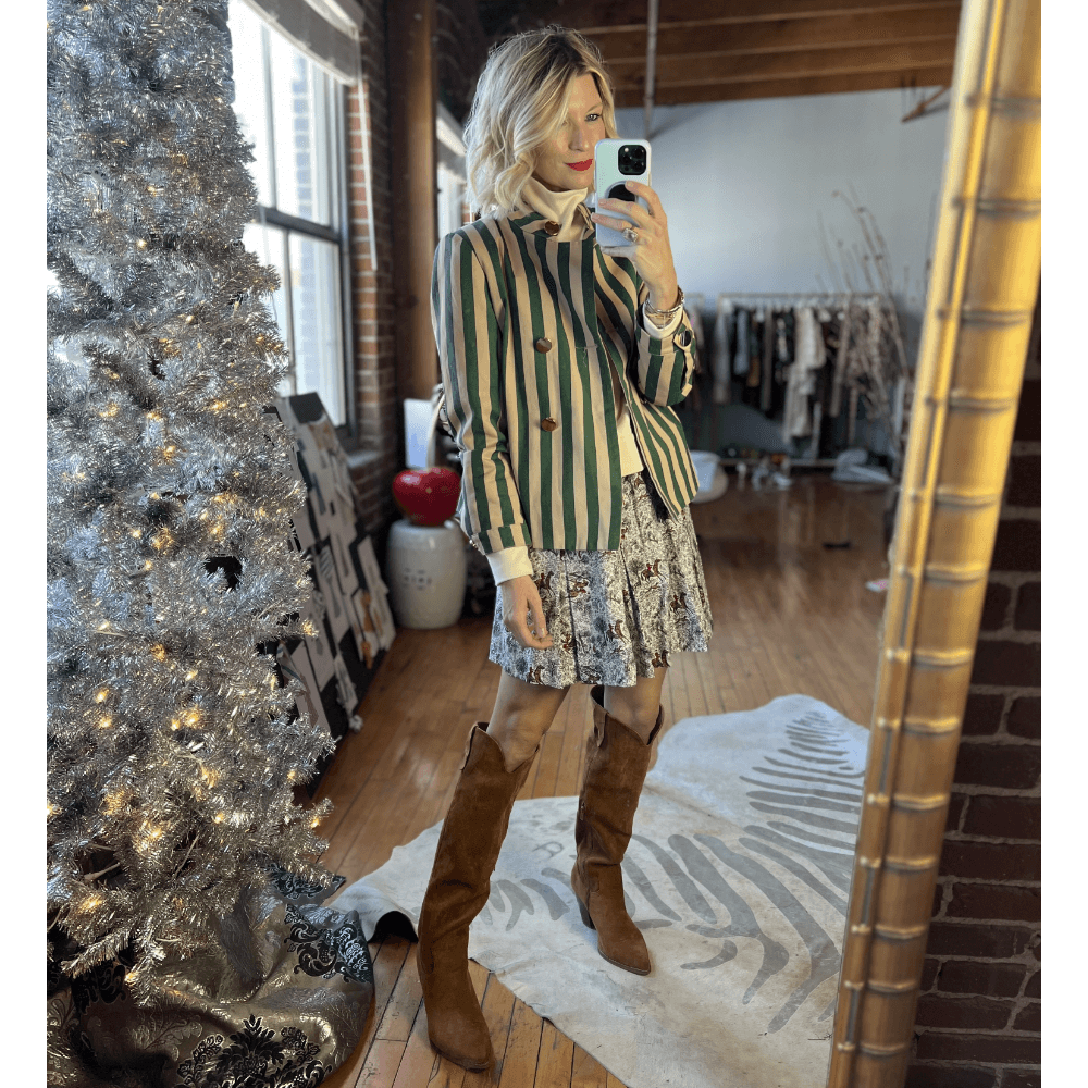 We love this look for winter sans tights if your climate can bear it. The Green Stripe and green accents in the Horse Toile make a perfect pair and the knee high boots give just the right amount of coverage.