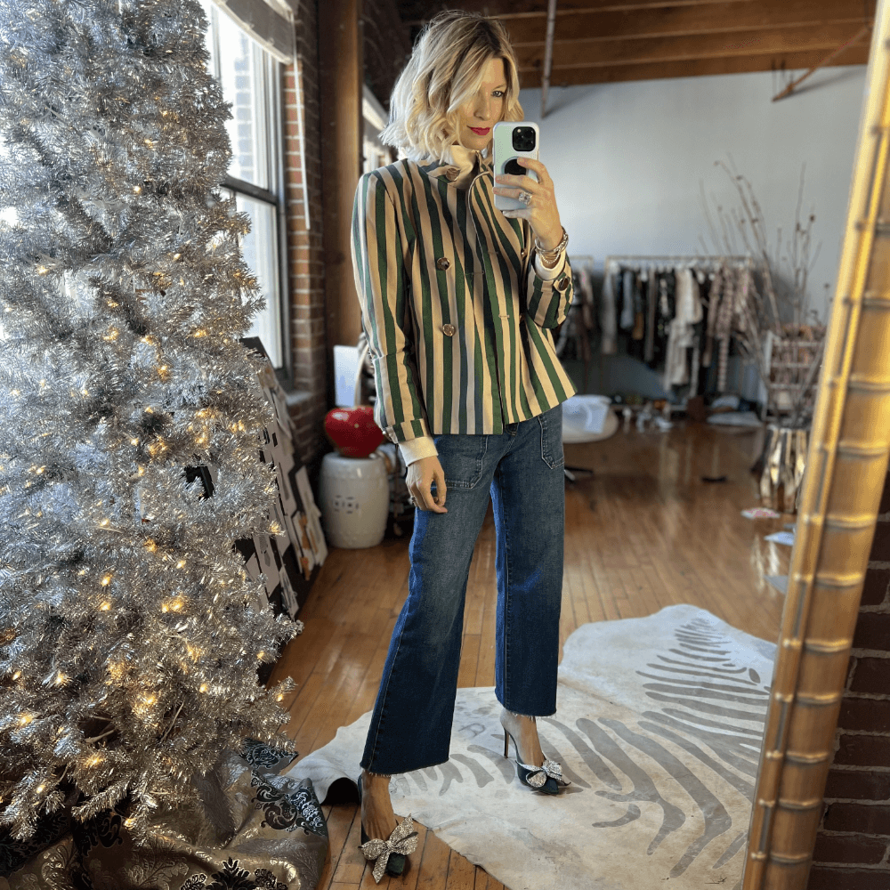 Pair the Swell Jacket for an easy daytime look over our Ivory Diane Turtleneck and Dark Wash Sailor Jeans. The Green Rhinestone Bow Mules add just a touch sparkle to the look.
