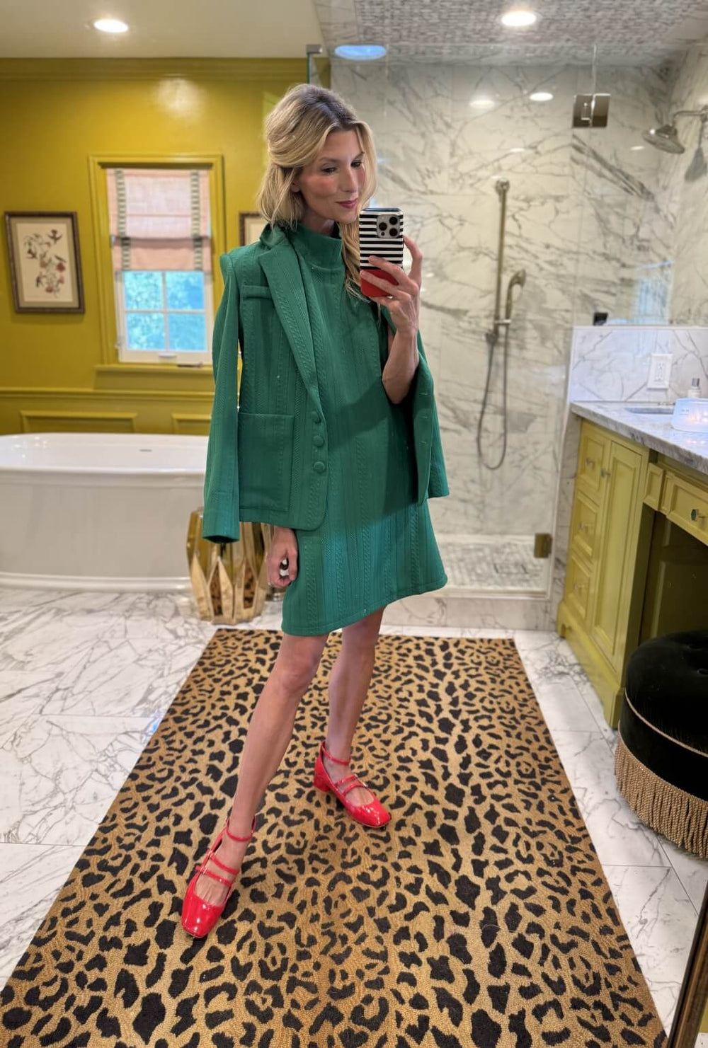 Styled with her matching blazer, we couldn't love her more. Turn up the holiday flare by adding a red shoe to finish the look.