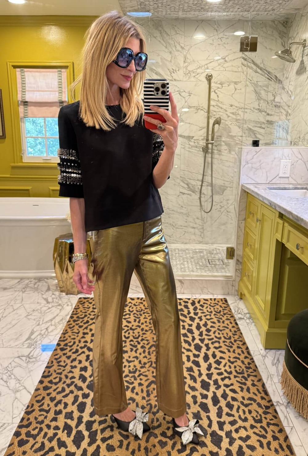 Our black Nea Top is the perfect complement to the Tate Trouser in gold lamé. This look is perfect for a holiday cocktail party.