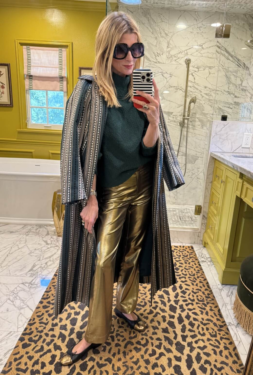 Gold pants, but make it sophisticated. Add our Carlyle Sweater in Deep Green and top with our new Evening Coat for a look that is both bold and sophisticated at the same time.