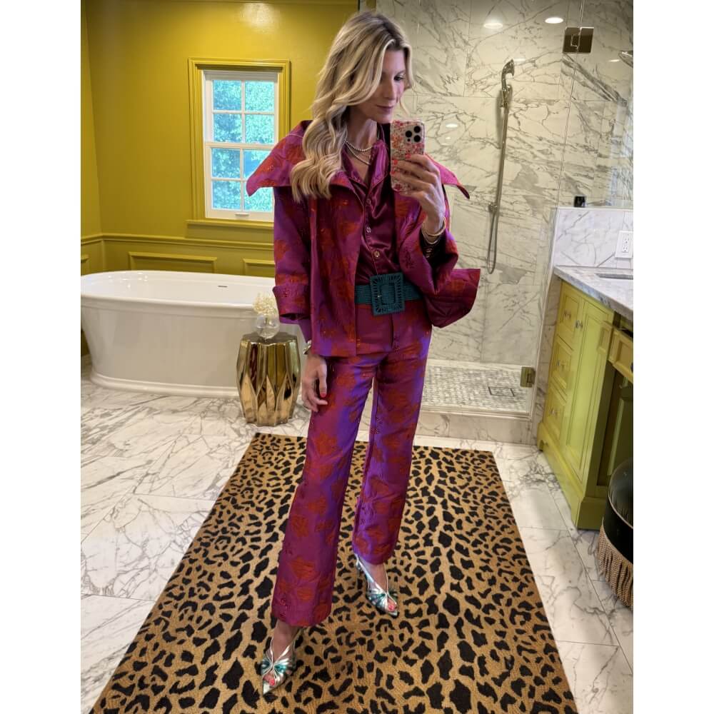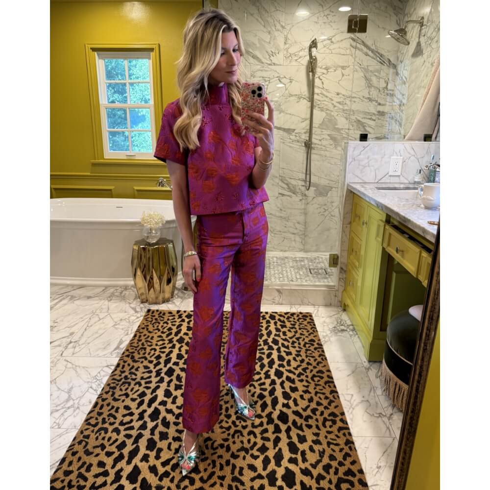 Meet the Tate Trousers—our latest silhouette featuring a tailored fit and a slightly lower rise than our Charlie Pants or Le Culottes. Finished with a smooth, structured waistband for a refined look, the streamlined design delivers effortless polish from day to night. This version, crafted in luxurious Rani Pink Brocade, is part of our India-inspired collection—a vibrant nod to the rich colors and textures discovered during the Hutchinson family’s journey abroad. Style with the matching top for a head-turning set, or pair with a crisp blouse for a chic, standalone statement.