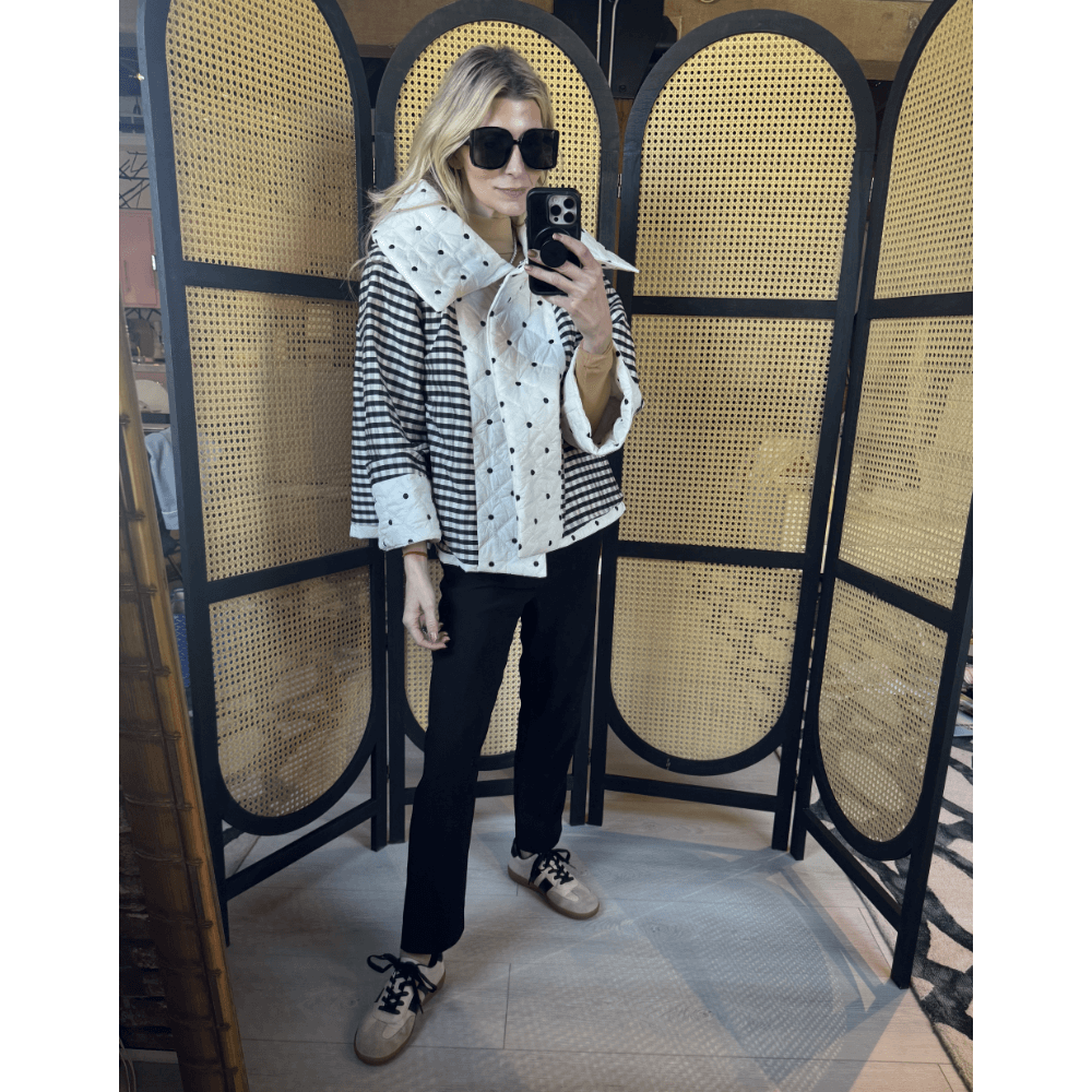 If you love a contrasting print, flip the Car Coat inside out to reveal the darling black and white gingham. Dress is down with black pants or jeans and a sneaker for an easy, daytime look.