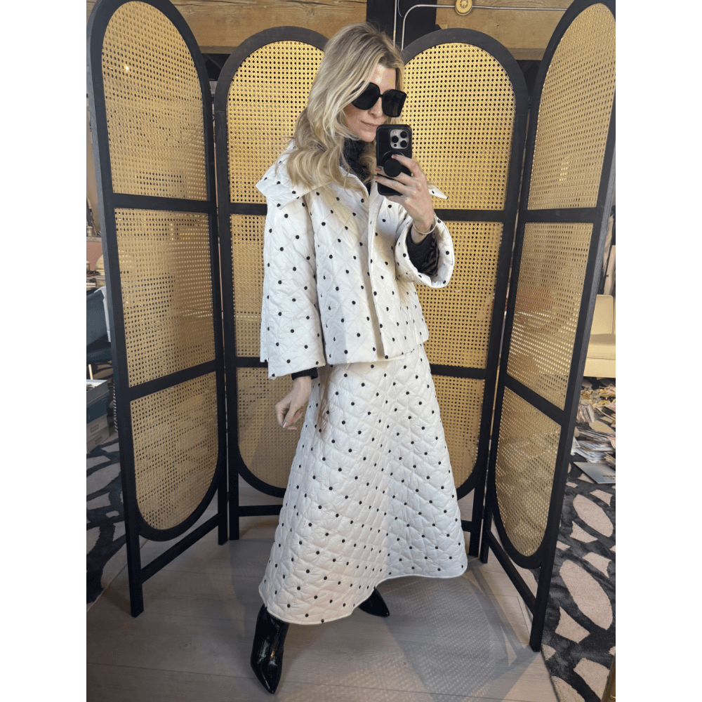 Full snow bunny fashion! After you hit the slopes (or even just if you are cold) pop on the matching Apres Ski Car Coat and Laura Skirt for a cozy, chic overall look. A slim black turtleneck keeps the ivory puffer pieces the star of the show.