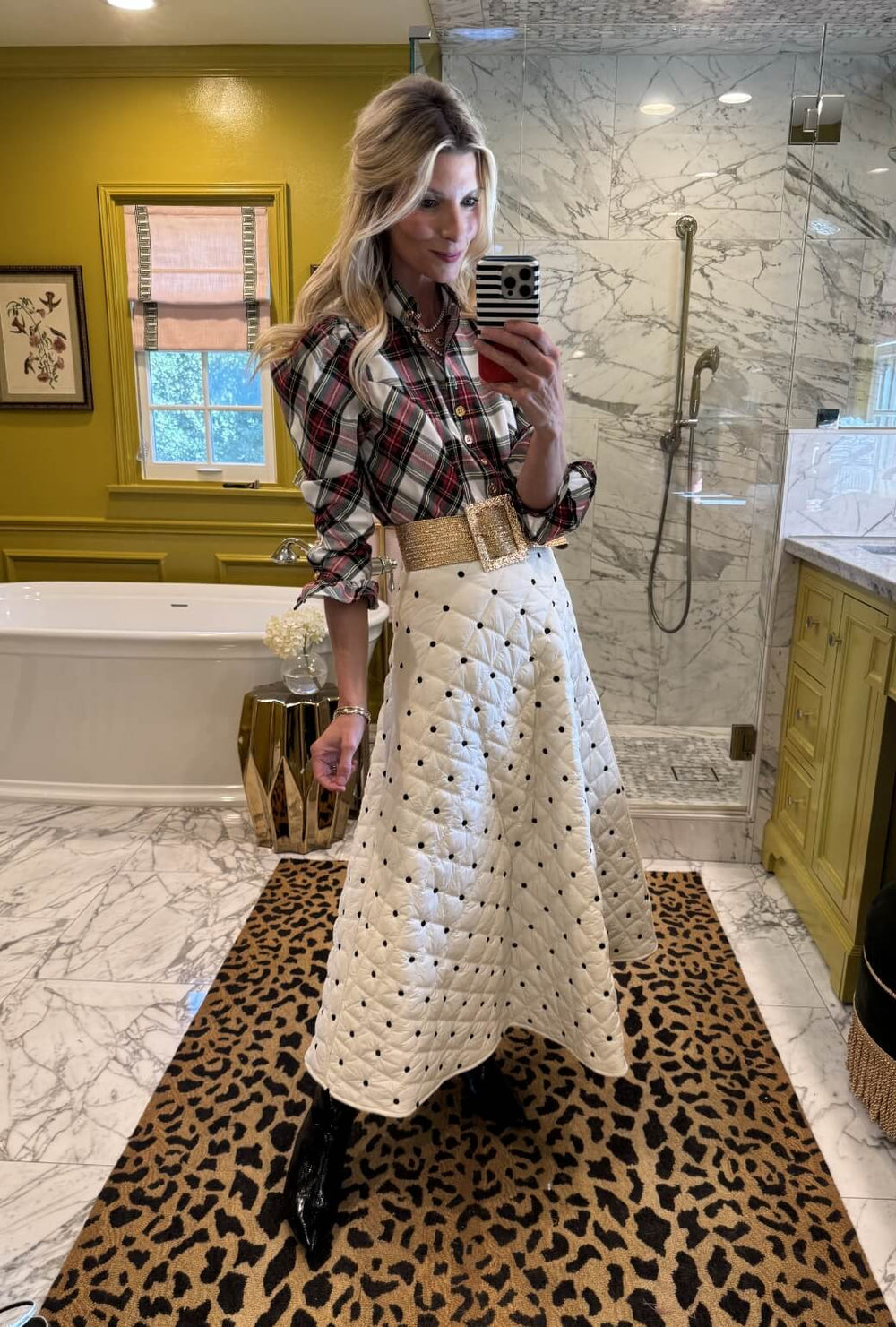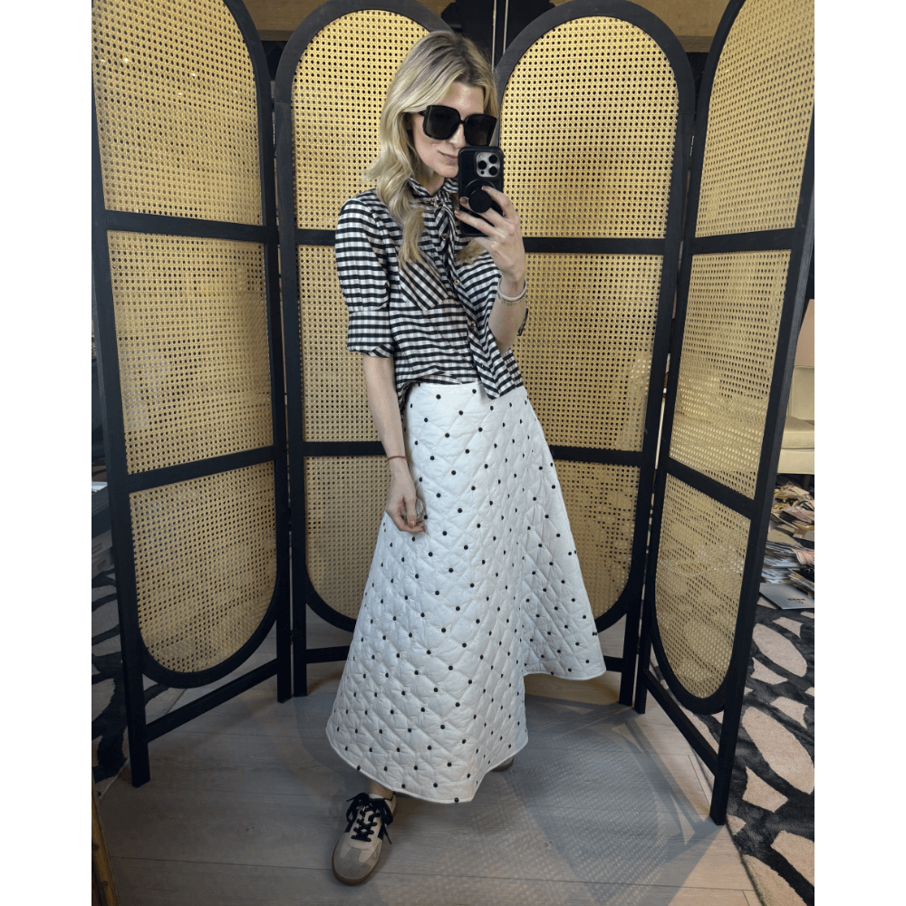 This classic gingham button down makes a fun accent to our Apres Ski Skirt in ivory puffer. Add a sneaker for an easy finish.