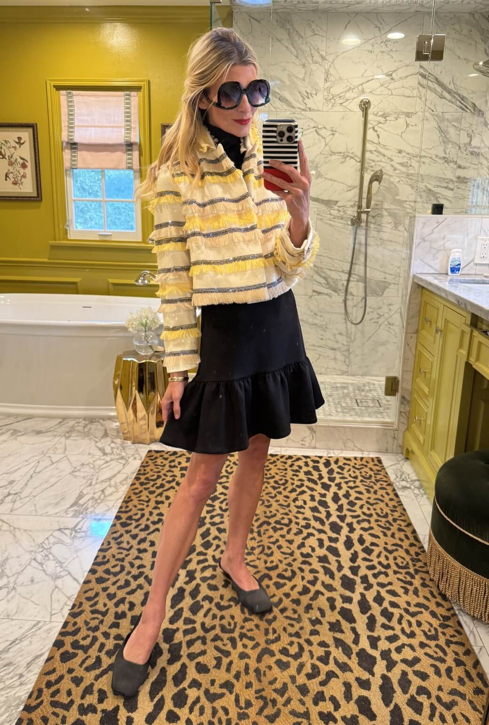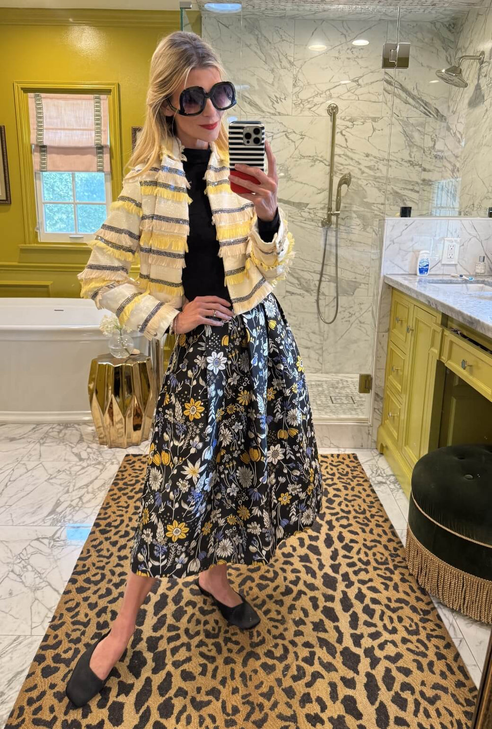 Style the Balen Blazer atop the coordinating Reed Skirt for a gorgeous mixed print ensemble. We are using The Birdie Dress as a classic black turtleneck in this styling with it easily tucked into the skirt.