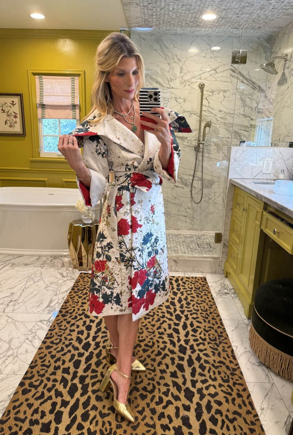 This exquisite brocade beauty stands on her own when wrapped tight and worn as a dress. Adding your favorite metallic shoe or our rhinestone bow mules finishes the look perfectly.