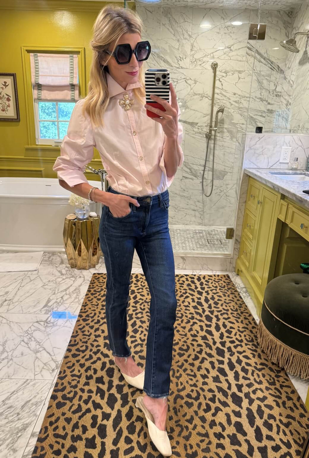A button down with jeans is easily the most classic look in your closet. We love adding a brooch at the neck to jazz it up just a bit.