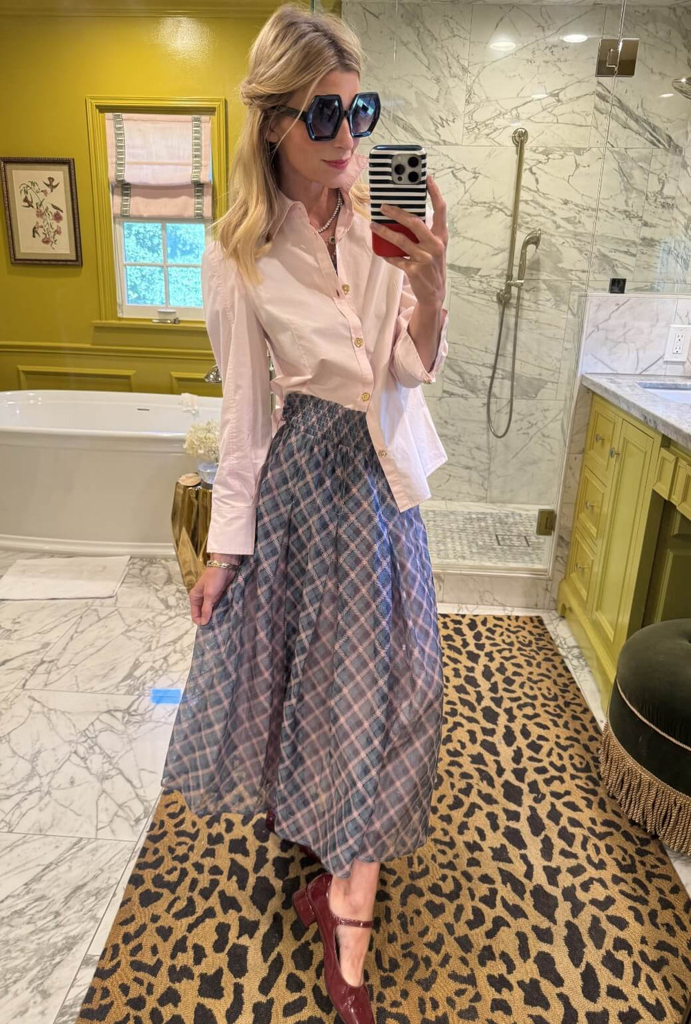 If you own our sheer plaid Smocked Waist Skirt, it's a perfect match with the ballet pink Brett Button Down. Keep it casual with a half-tuck up front.