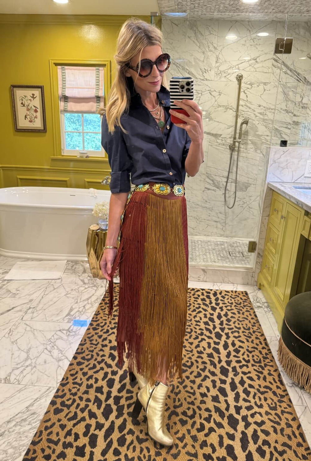 Western wear is having a moment and, honestly, who doesn't love an Ralph L. inspired look? This one comes with just the right amount of flair with our fringe skirt in rust tones and the navy Brett Button Down tucked in. Finish off with a turquoise medallion belt.