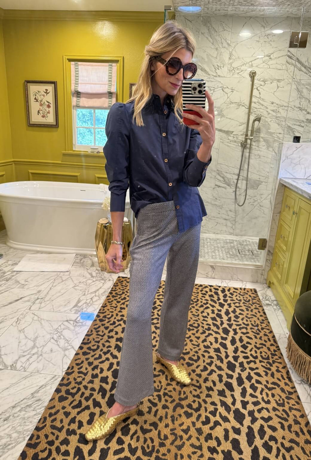 An easy look for a causal day at the office or a day full of errands...our Brett Button Down with the navy knit Paley Pant. This look is completely pulled together but comfortable enough for your day.