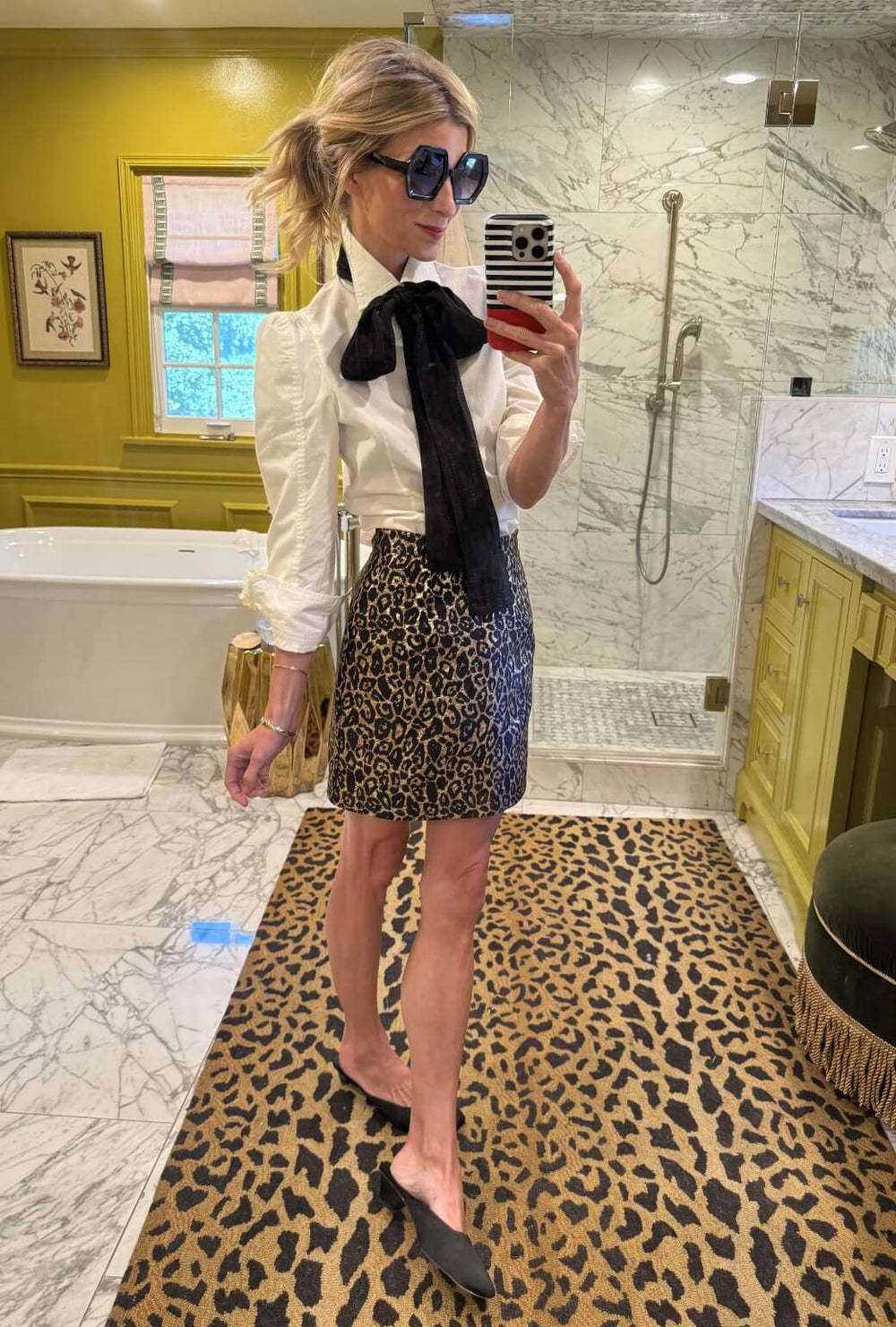 Create a playful look with the Brett Button Down and leopard lurex Mini Skirt. Grab any black tie you have (this one is actually a self belt) and create a contrast tie around your neck.