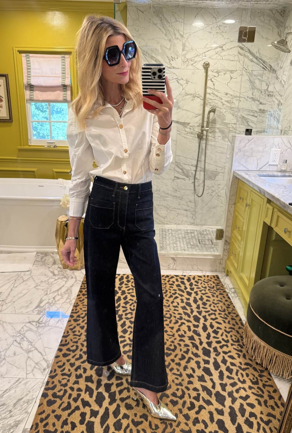 When you don't know what to wear, simply grab a white button down and pair with dark denim. A sparkly shoe adds flair but feel free to keep it simple with a standard pump.