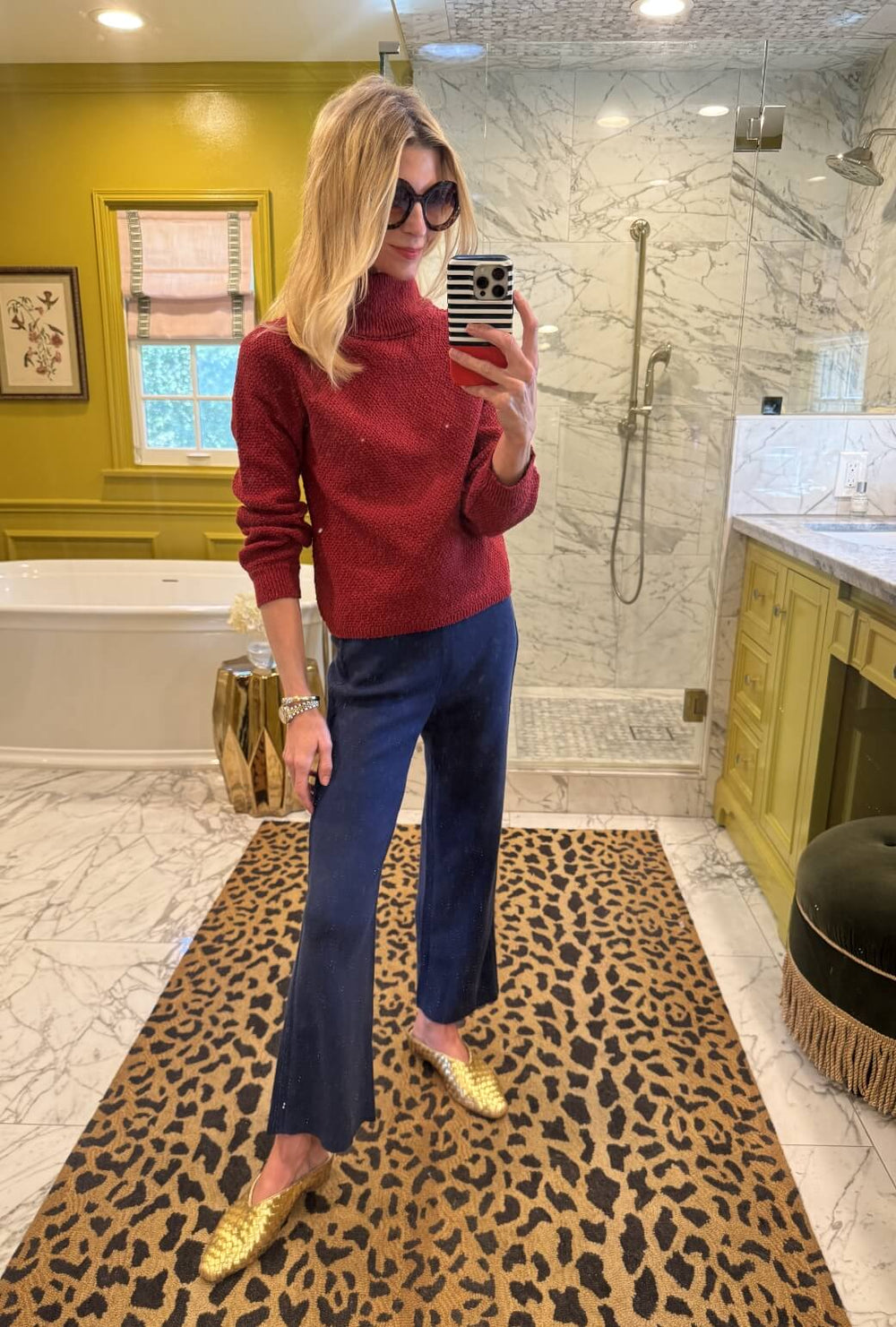The wonderful thing about out knits is that they mix and match beautifully. Here the Carlyle Sweater is perfect with the Bee Pants in navy.