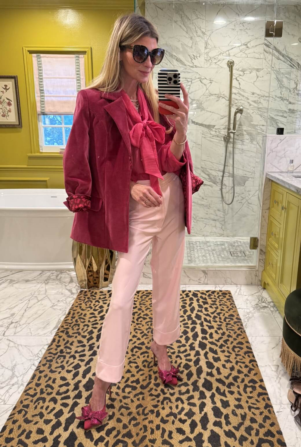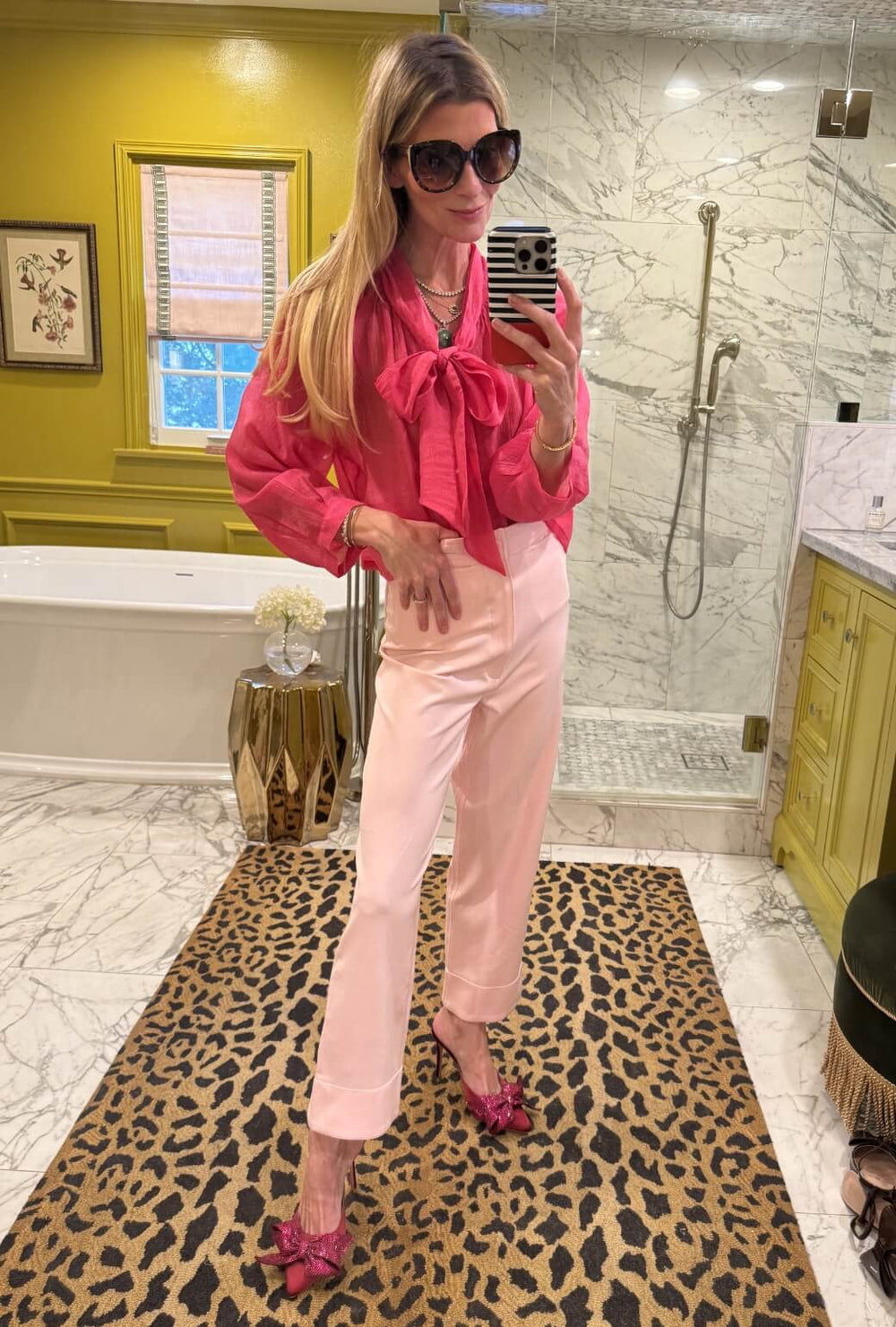 Blush and Bashful? We say yes. Pink on pink is our favorite, and this happy pairing proves why, finished perfectly with our pink silk Bow Blouse for a polished, tonal look.