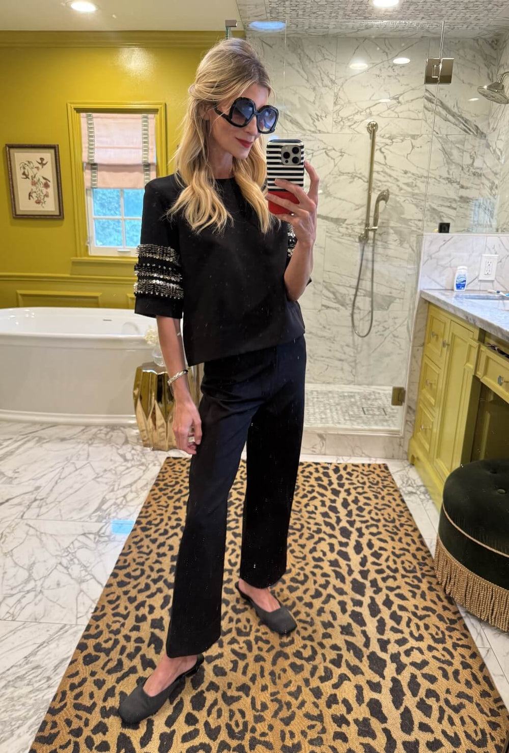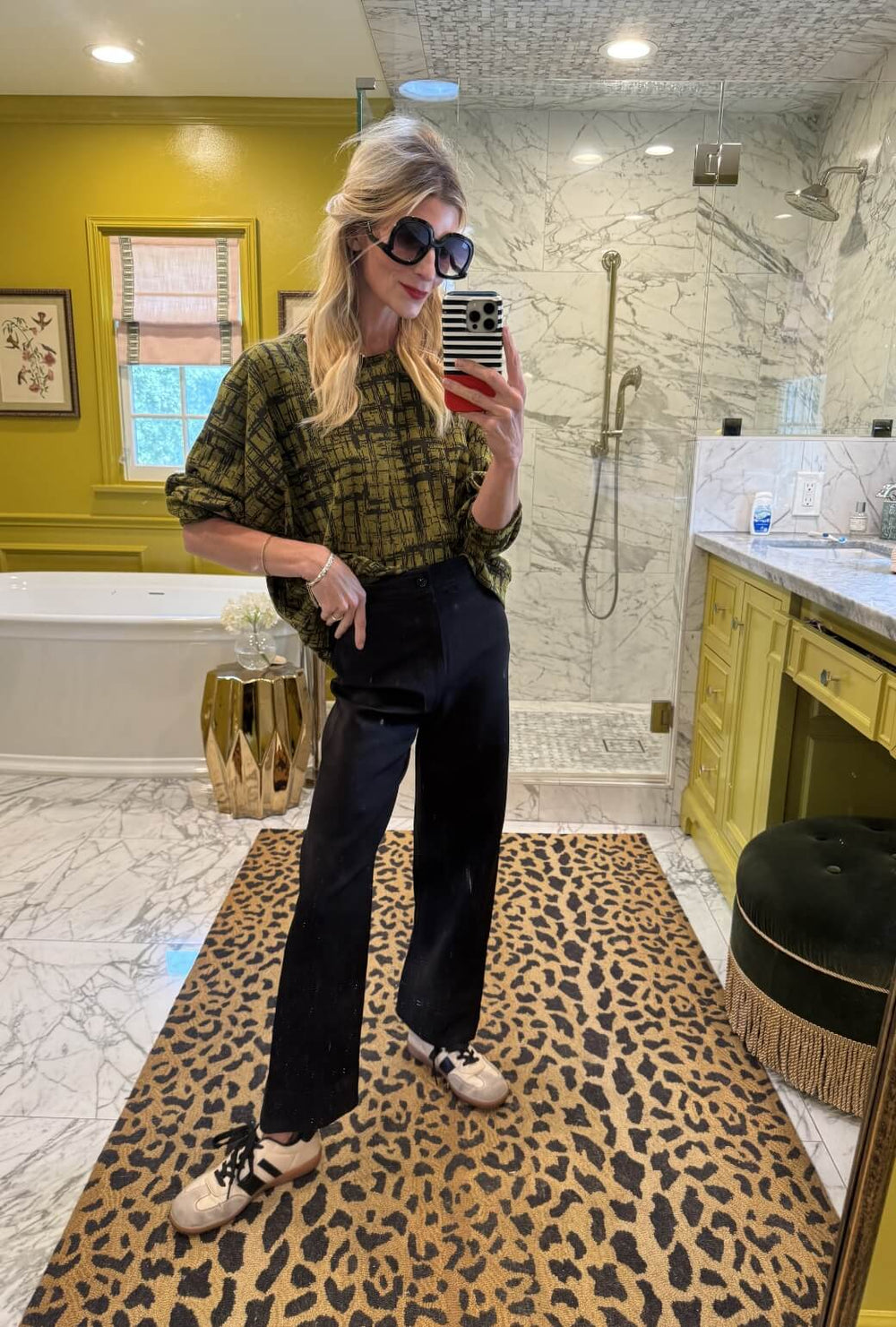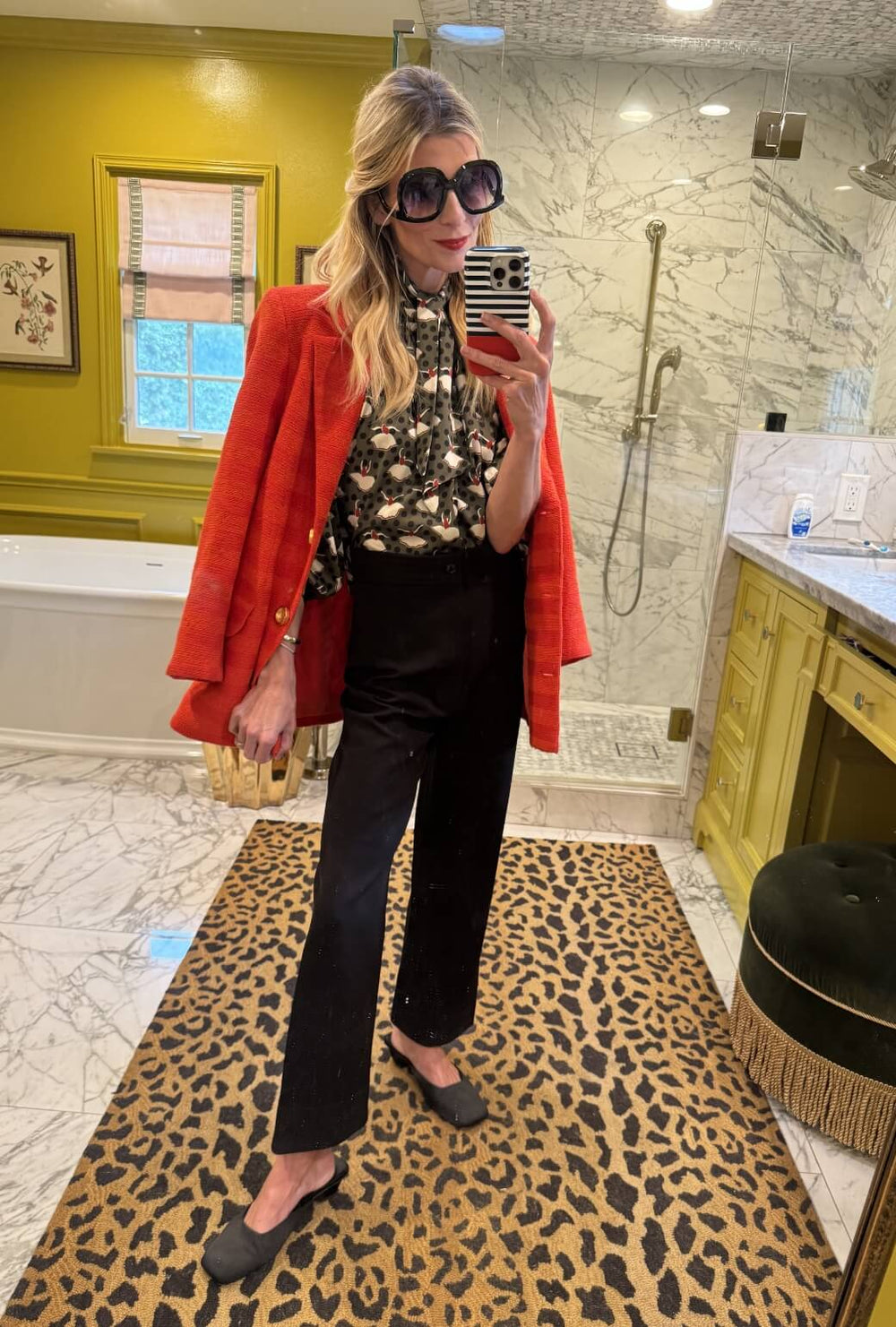 Black pants make for effortless styling and leave room for fun prints to take center stage - perfect for our dancing ladies print Big Bow Blouse. Add our pop-of-color Boyfriend Blazer in L'orange on top.