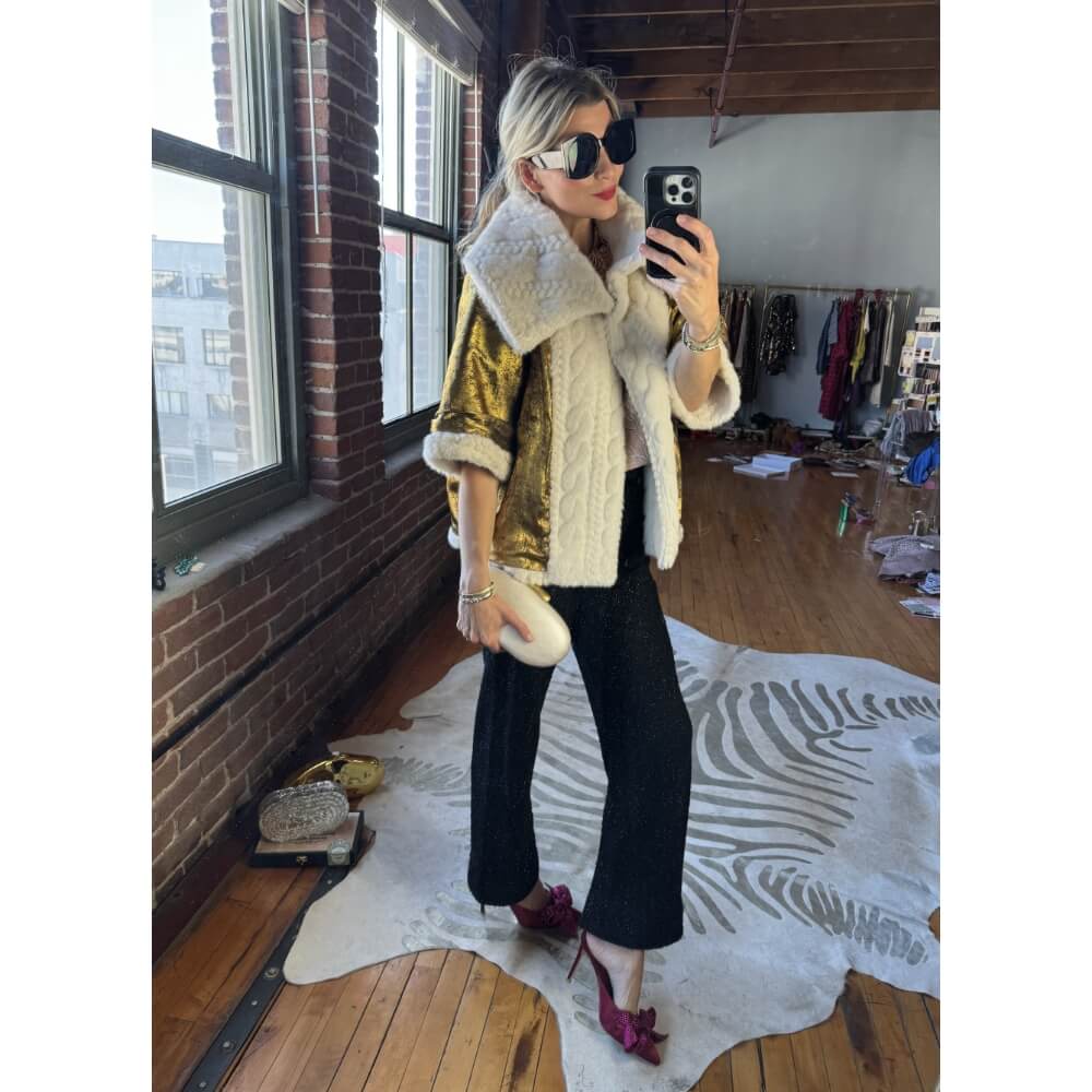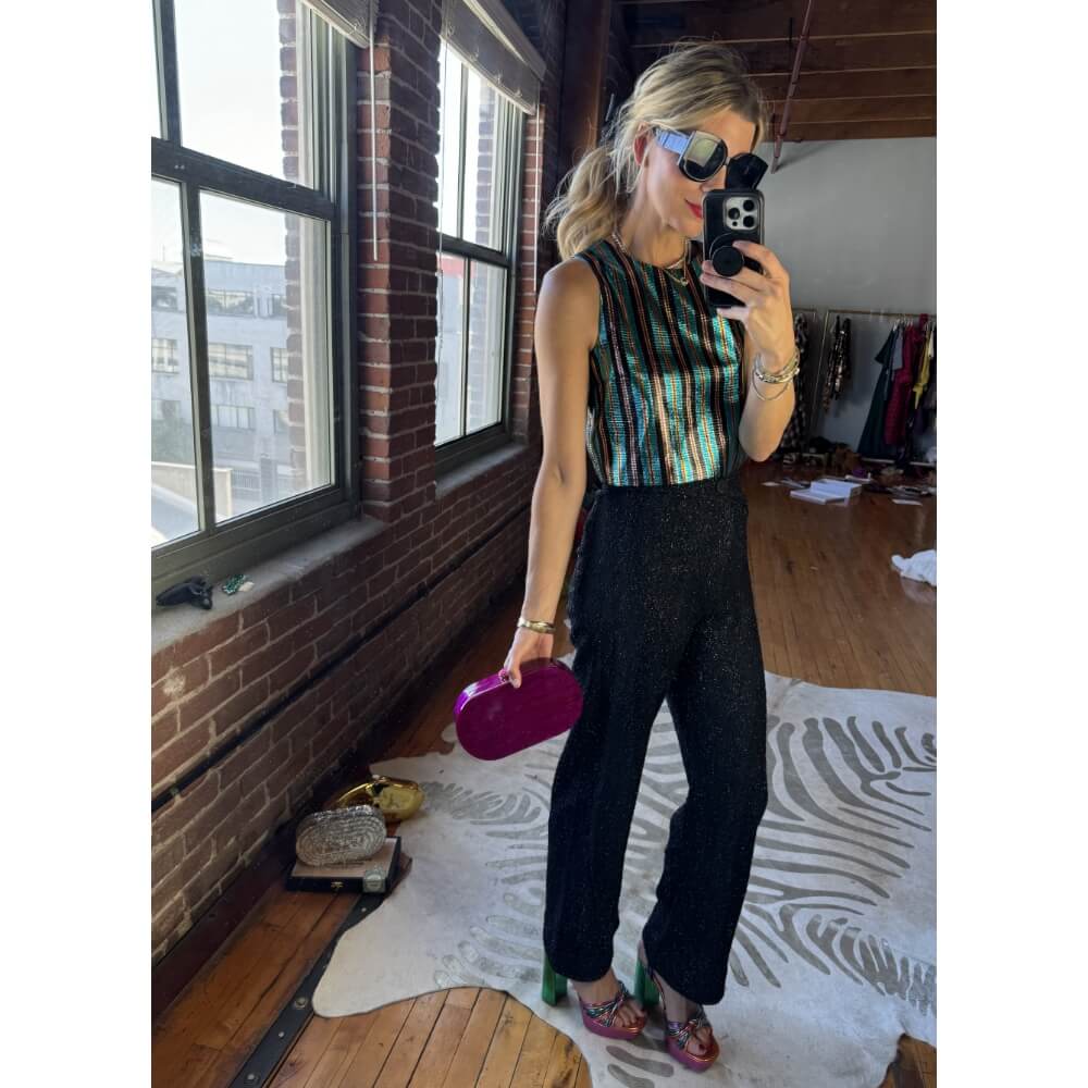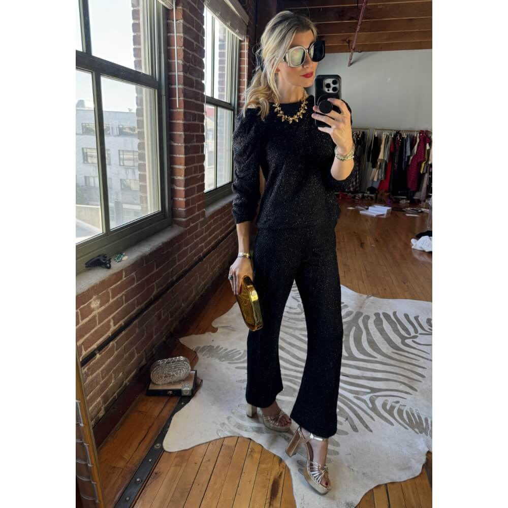 Style the Puff Sleeve Pullover with our Black Shimmer Charlie Pant. This adds a sophisticated yet structured look. Pops of gold, including the Elsa Clutch and Metallic Platforms really say cocktail ready!