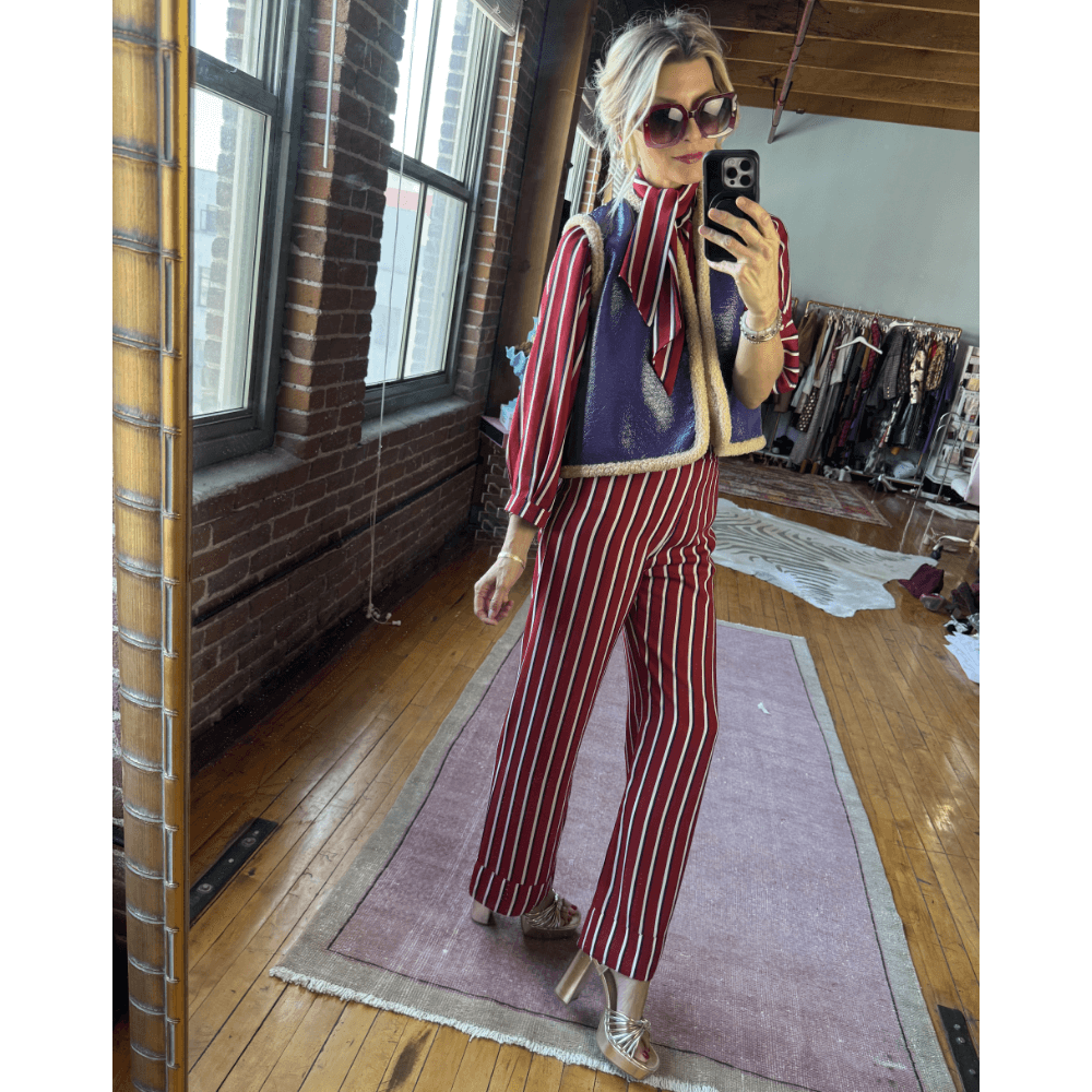Add a layer of interest (and warmth) to this look by layering the Cropped Vest on the purple side on top. This look dresses down the blouse/trouser purple pinstripe combo just a bit.