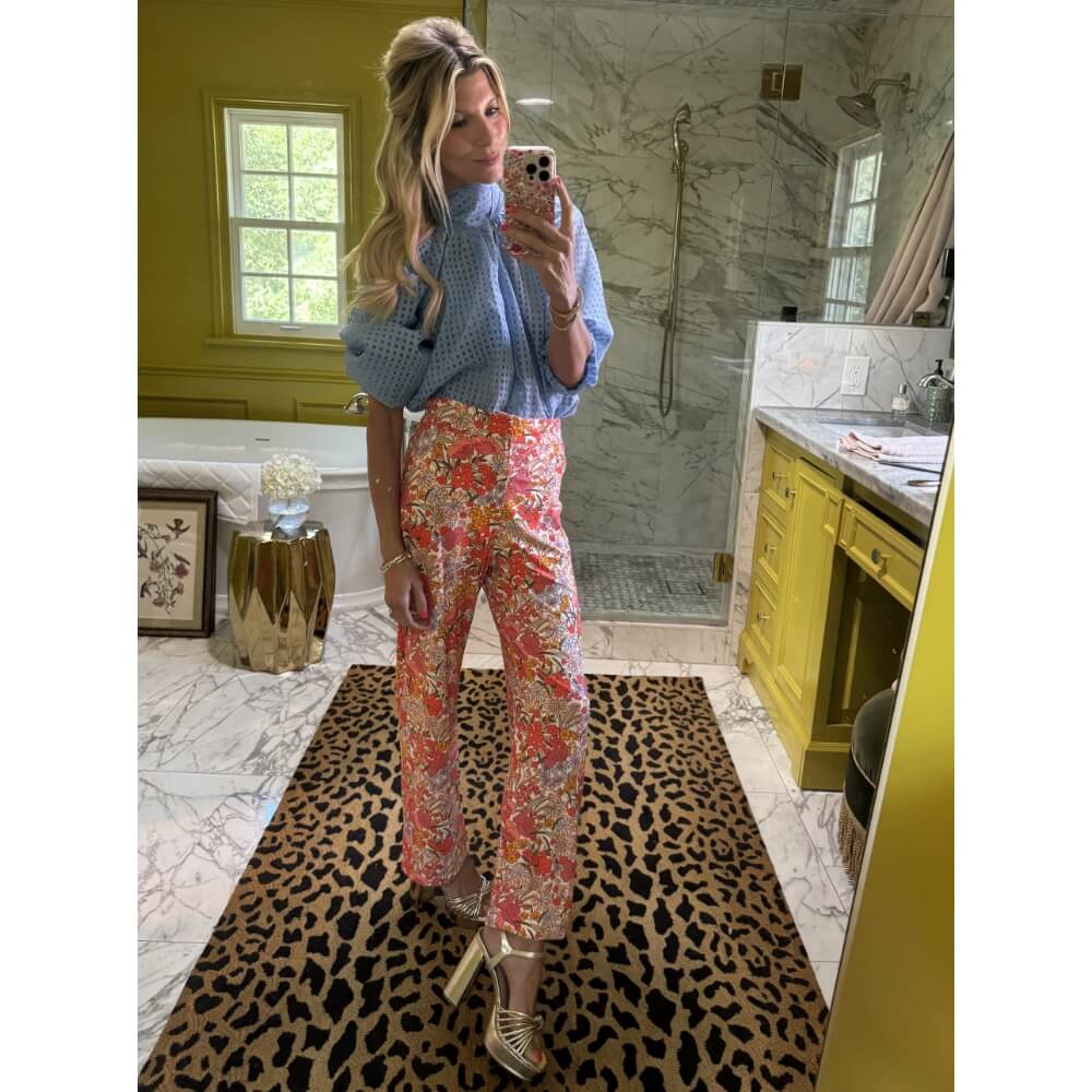 We’re swooning over this spring-ready styling. Our sheer blue gingham Big Bow Blouse is the perfect partner for these fab citrus-hued pants. Add a metallic platform and you’re out the door in standout style.