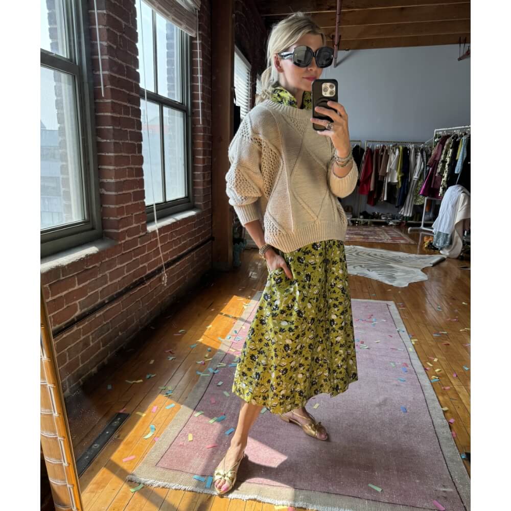 When the weather starts to turn, layering a sweater is a great way to winterize your dresses. The oatmeal fisherman sweater lightens this up and is more unexpected than black.