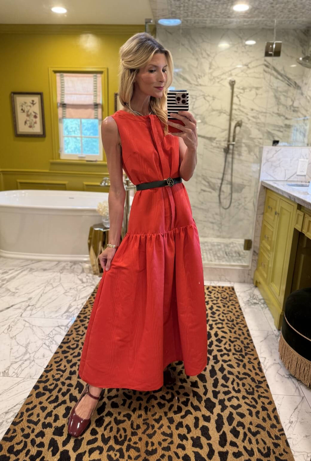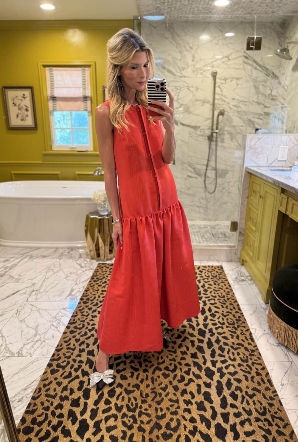 Lady in red! The Drop Waist Gown in classic red moiré may be part of our Holiday Collection, but she's got staying power for special occasions throughout the year. With a straighter fit (though not tight!) through the bodice, hidden buttons and a voluminous skirt, she's a perfect choice for your next party. She comes with a self belt that allows you to create a totally different silhouette by cinching the waist. And you can even dress her down by layering over your favorite fitted turtleneck.