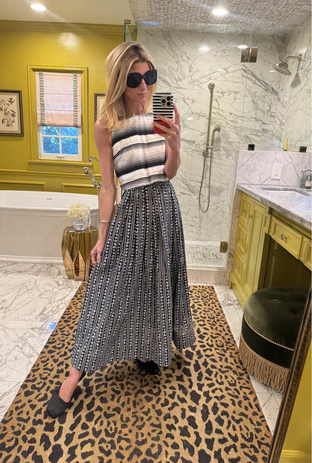 Dressed up in black and white, adding our black and white stripe Audrey Top. With vintage black enamel and rhinestone buttons, it adds the just the right amount of flare.
