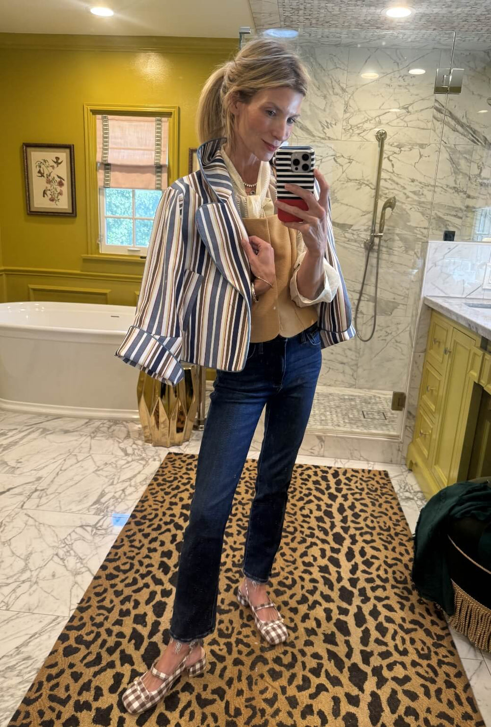 The perfect look for date night, style with a bow blouse and dark wash denim. The blazer over the shoulders is the cherry on top. Style plus warmth for chilly nights.