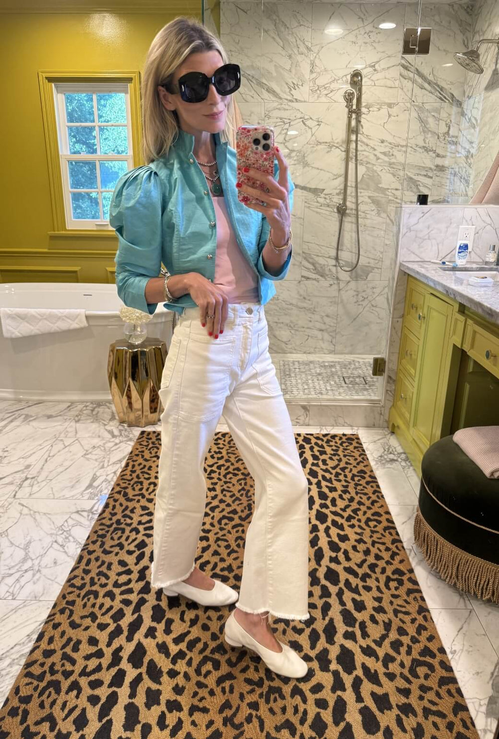 Leave the Kennedy Jacket unbuttoned for a more relaxed look - and a great evening layer if you live somewhere with cool evening temps in the summer. A slim fitting body suit and white jeans keeps this look casual.