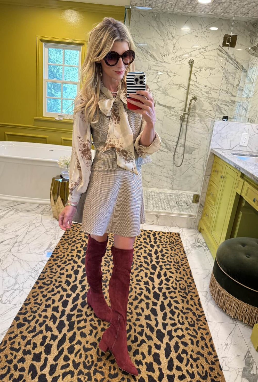 For a more winterized look, layer our ivory floral Bow Blouse under the Paulina Top and a statement over-the-knee boot.