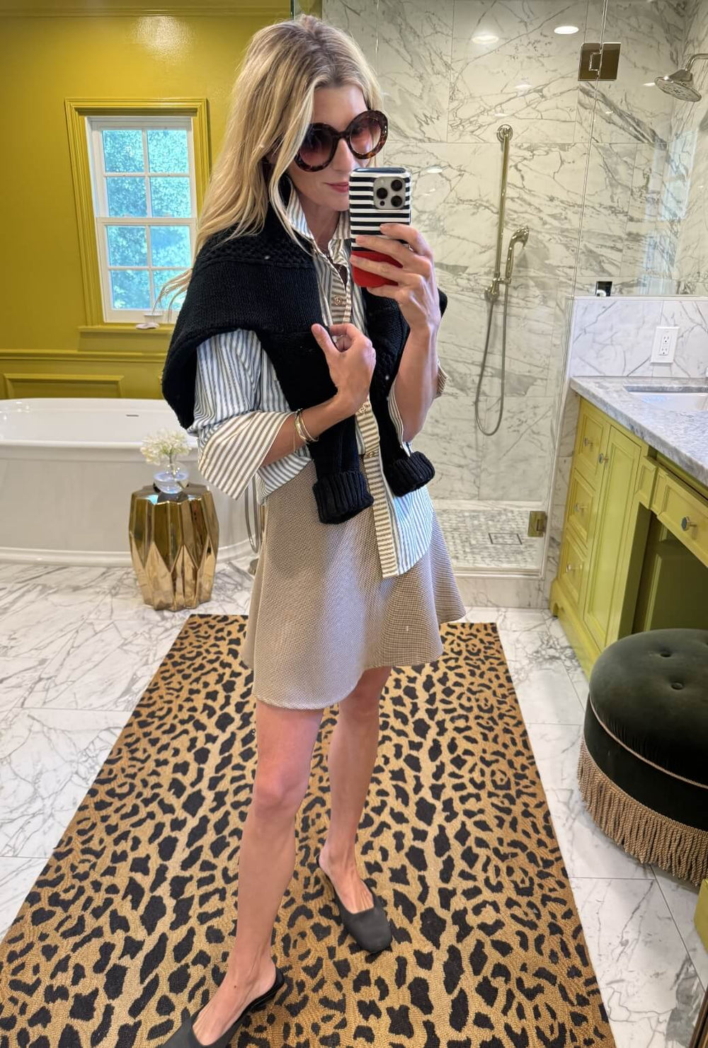 Dress down the Laura Skirt Mini with a front tuck of our ticking stripe Mel Mixed Button Down and a casual shoulder drape of your favorite sweater - shown here with our Fisherman Sweater in black.