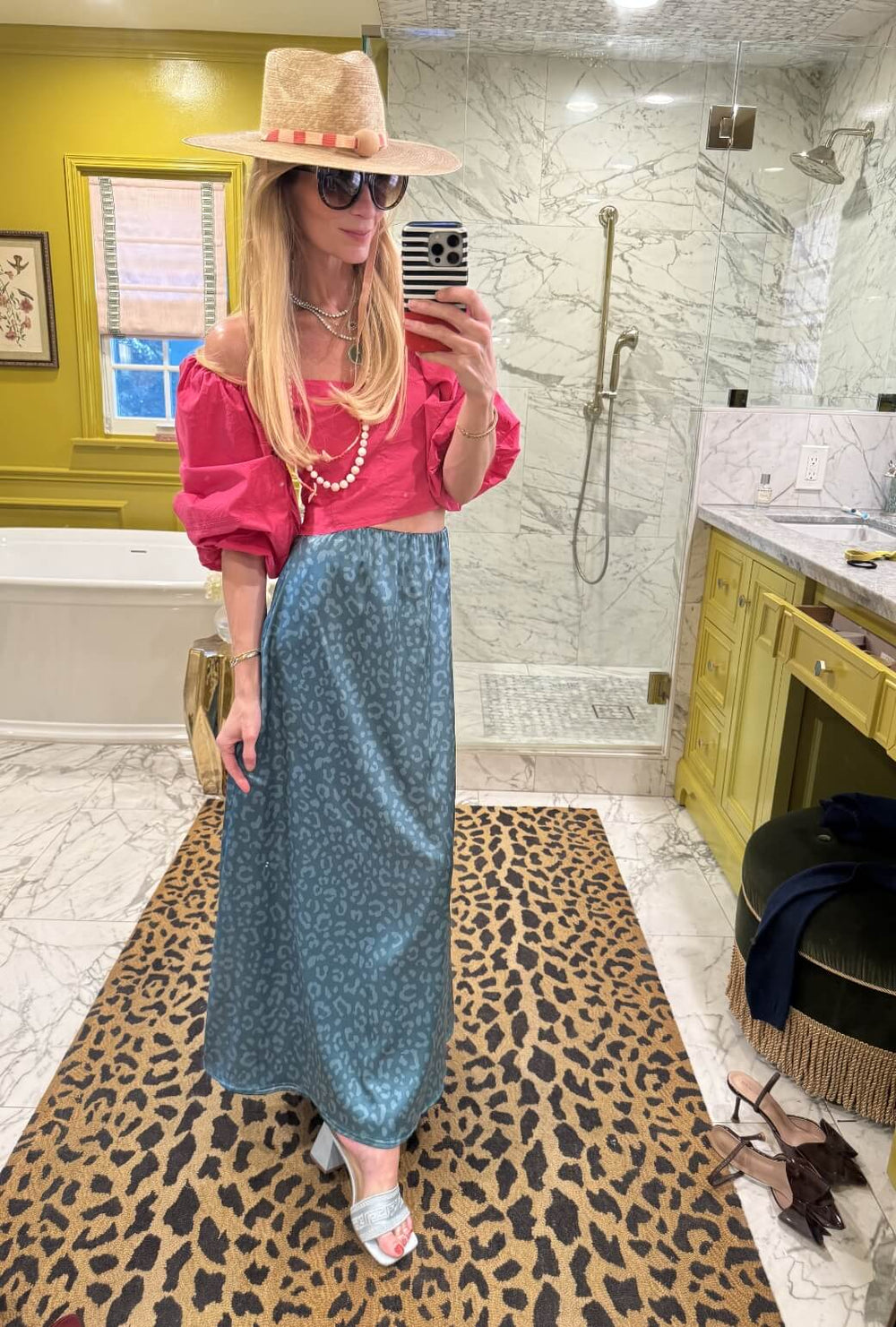Winter resort vacay or spring break someplace sunny? Pull out your OG Buru Puff Sleeve Bustier to add a punch of pink to our Aqua Cheetah Leland Skirt. Tonal Sandals and a straw had complete this sunny styling.