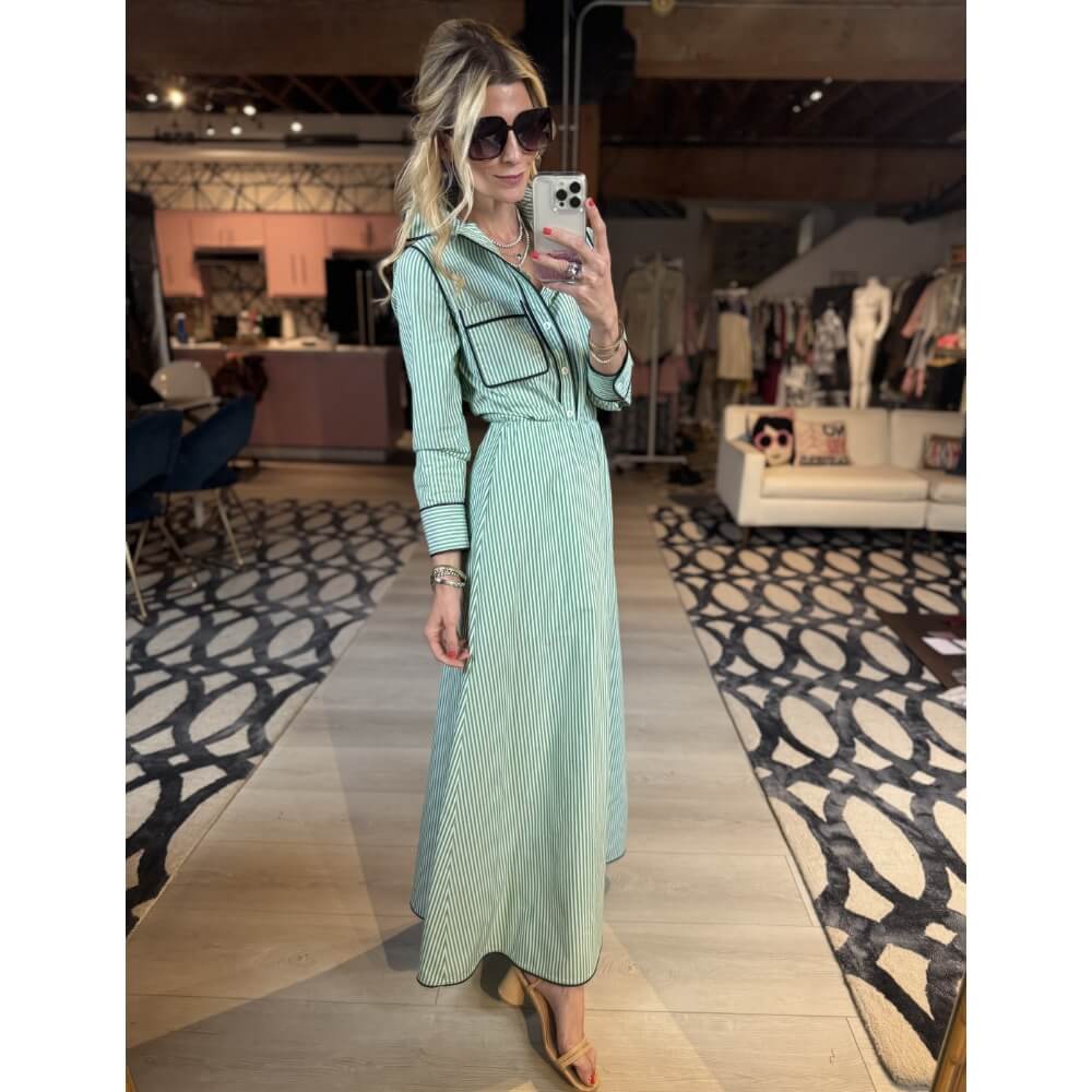 Our Green Stripe Leland Skirt is a fresh update to our beloved Everyday Midi Skirt, offering a streamlined silhouette with a flattering flat front. But don’t worry—she still delivers on comfort with a hidden elastic waistband and a handy back pocket that fits your phone. Made from green and white poplin with a navy piped hem, she’s the perfect choice for her matching Perry Blouse or mixing with your favorite top. Lined halfway down, she stays light and airy. Fresh, versatile, and oh-so-polished!