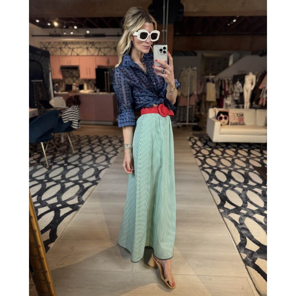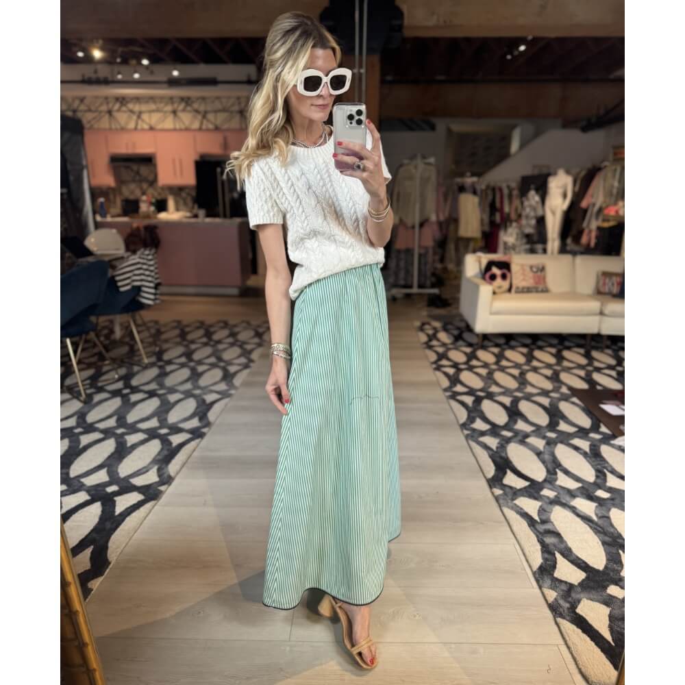 Our Green Stripe Leland Skirt paired with a short sleeve cable knit sweater in crisp white is the ultimate spring combo. We’re loving this look with raffia sandals and playful sunnies for an effortlessly chic vibe. Fresh, polished, and ready for anything!
