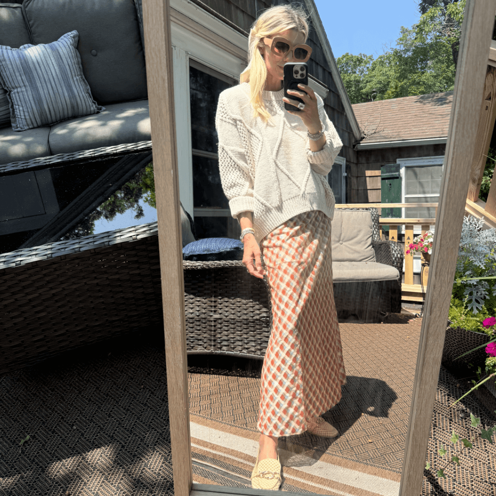 While this skirt works for a special occasion, it's also great to dress down. Paired here for cooler temps with the Oatmeal Fisherman Sweater and our Cane Loafers - this look is late summer perfection.