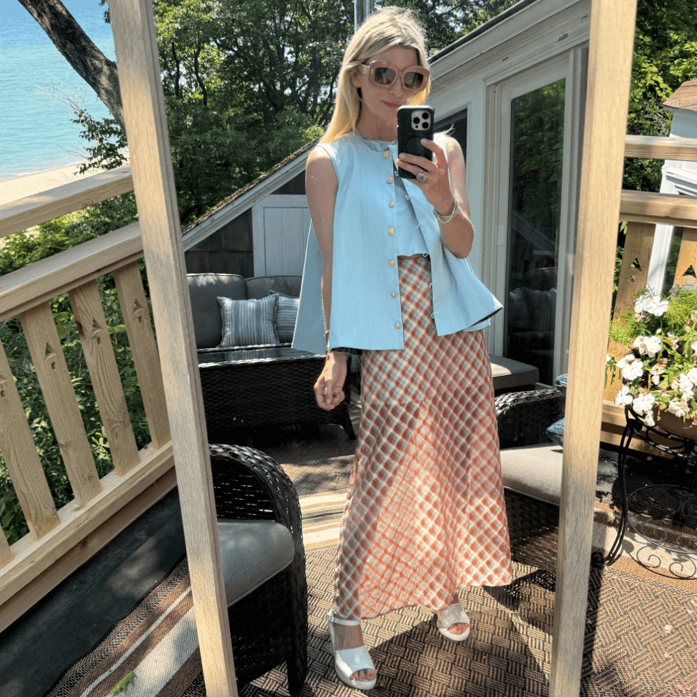 Our new Leland Skirt is a fresh take on our Everyday Midi Skirt with less volume and a flat front. But do not fret, she still has a hidden elastic waist and a back pocket big enough for your phone! And we've crafted her out of an aqua, brown and cream hued sheer plaid over a mini skirt liner for a fun-and-flirty look.