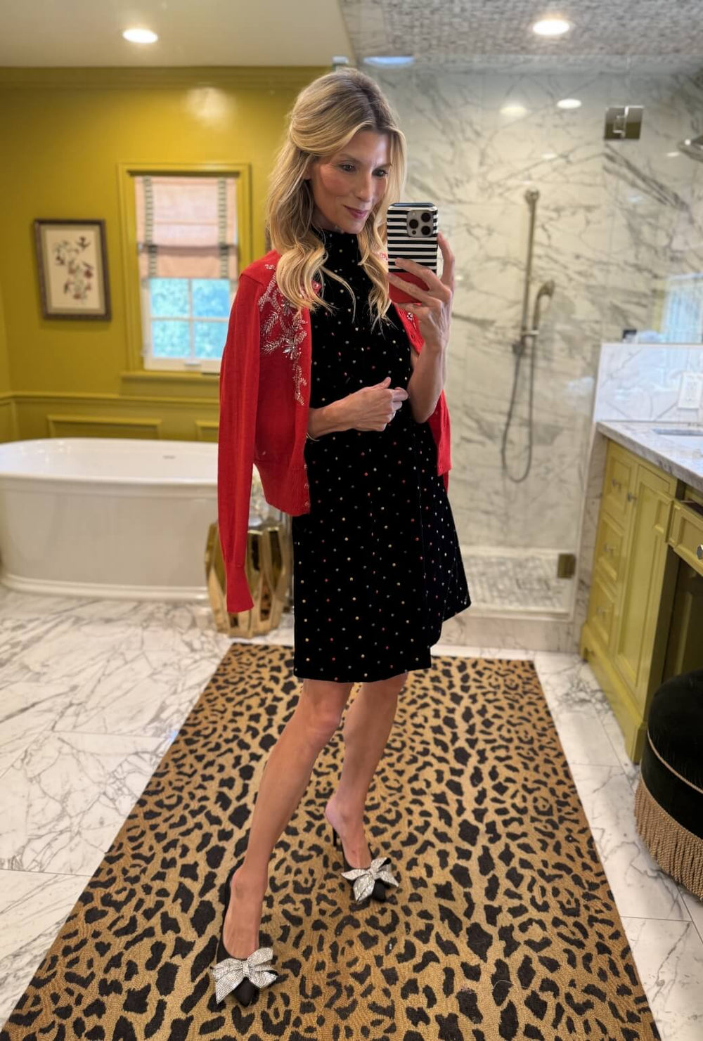 Cocktail party ready when draped over your shoulders over any festive frock. We are partial to this mod mini-velvet with embroidered dots and our signature rhinestone bow mules.