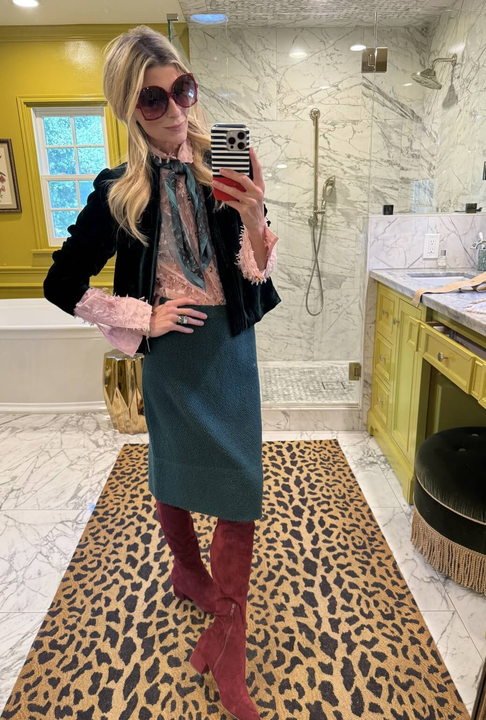 Treat the Madison Skirt as the most comfortable pencil skirt ever. Add an easy button down - shown here with our Mel Button down in blush bows and layered under the velvet Mona Lee, this look is a twist on a traditional look.