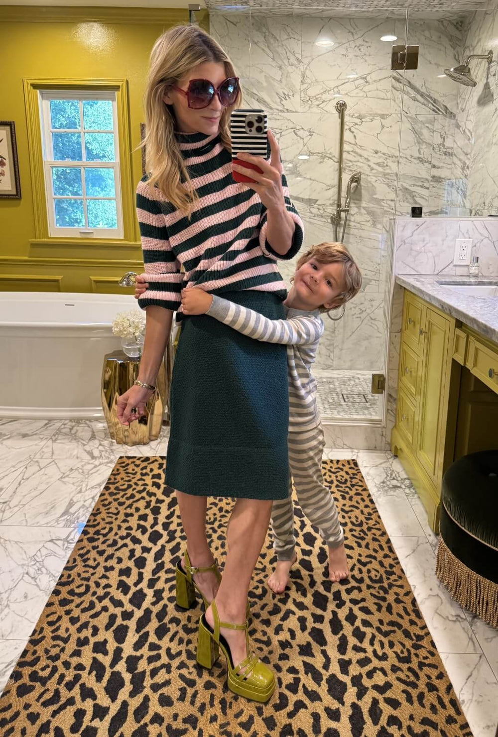 Mix up the matching set by adding our Schafer Stripe Sweater in Deep Green and Ballet Pink. A more relaxed look, this styling looks as good with a flat as it does with your favorite patent leather flat.