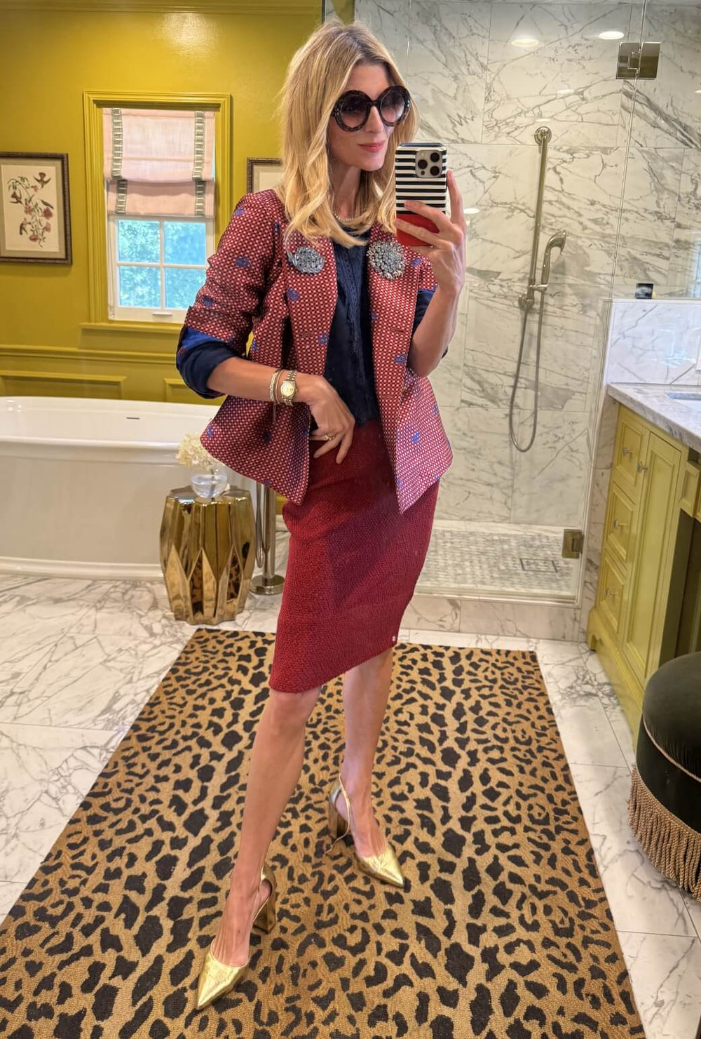 The wonderful thing about out knits is that they mix and match beautifully. Here the Madison Skirt is perfect with the Olive Fringe Sweater in navy. Our Swell Jacket in cranberry gingham with blue rose details effortlessly pulls the two pieces together.