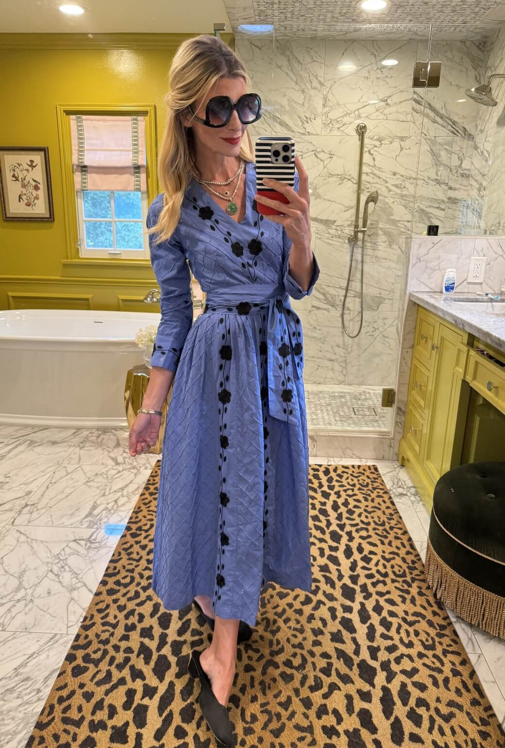 The black contrast embroidery on the new Nicolette Dress acts as an accessory. Simply add your favorite black flat and be on your way!