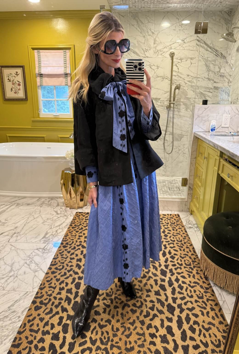 For a wintery look, add our Cropped Grace Coat in Noir Moiré atop the Nicolette. Use the self belt as a neck tie to create a beautiful bow to accessorize the collar. Black boots finish this ensemble.