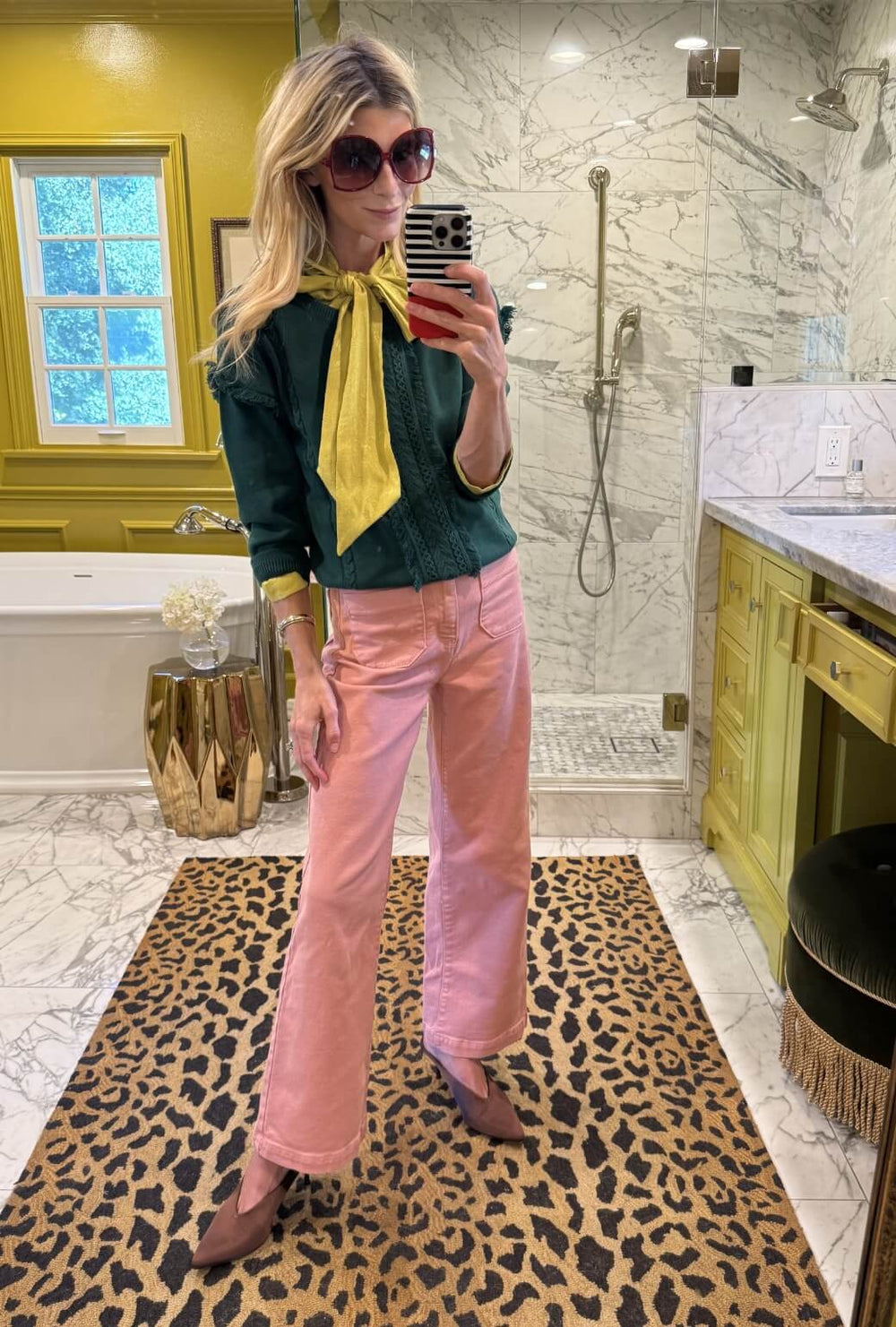 A twist on traditional styling, add the Olive Fringe Sweater atop our chartreuse bow blouse and paired with the Patch Pocket Jeans.