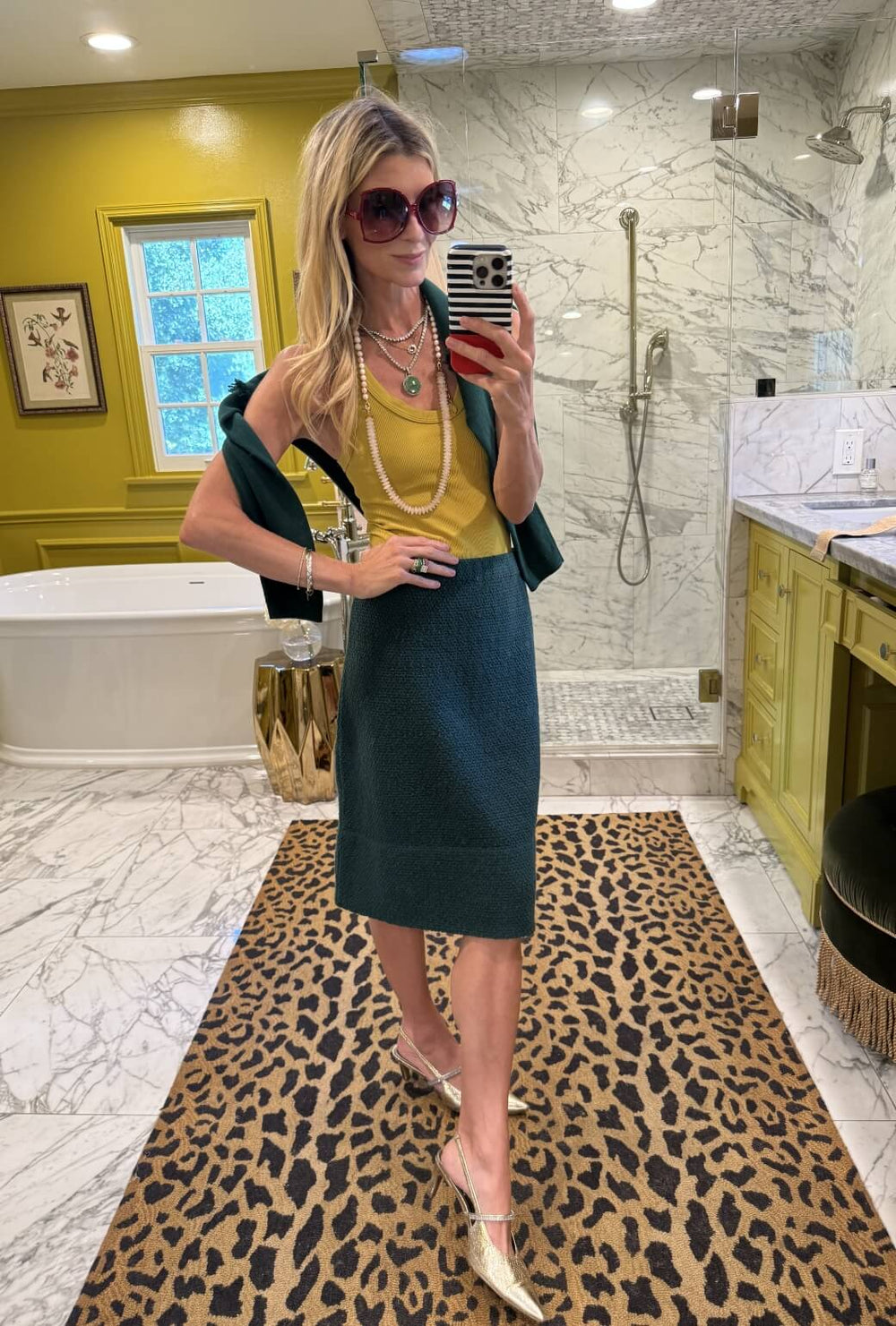 The deep green hues of the Olive Fringe Sweater make her a perfect match with the bouclé Madison Skirt. Add a sleek tank to this look for a flirty date-night ensemble.