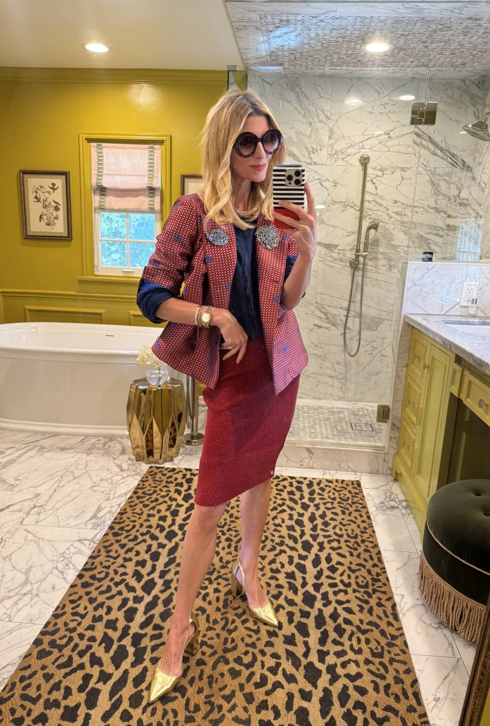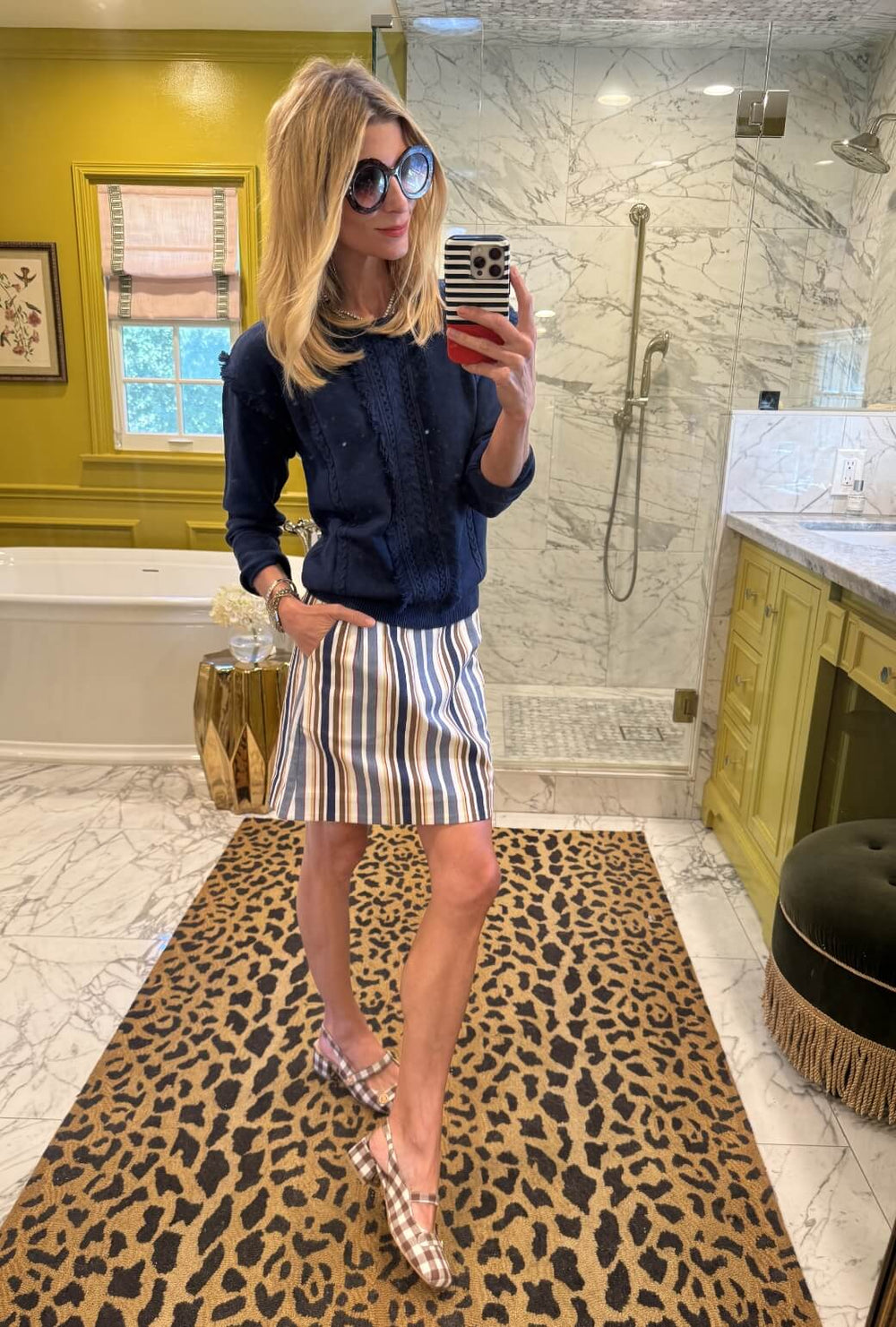 The wonderful thing about out knits is that they mix and match beautifully. Here the Madison Skirt is perfect with the Olive Fringe Sweater in navy. Our Swell Jacket in cranberry gingham with blue rose details effortlessly pulls the two pieces together.