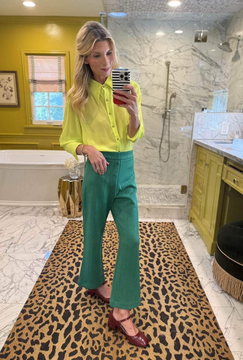 These pants are great for the holidays but that does NOT mean they aren't wonderful all year long. We adore the kelly green and chartreuse pairing with our Skipper Blouse.
