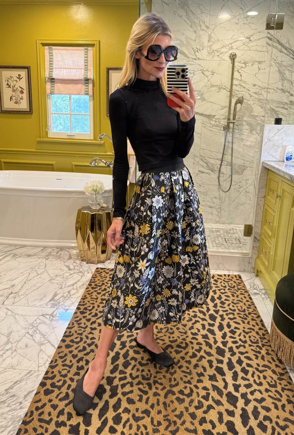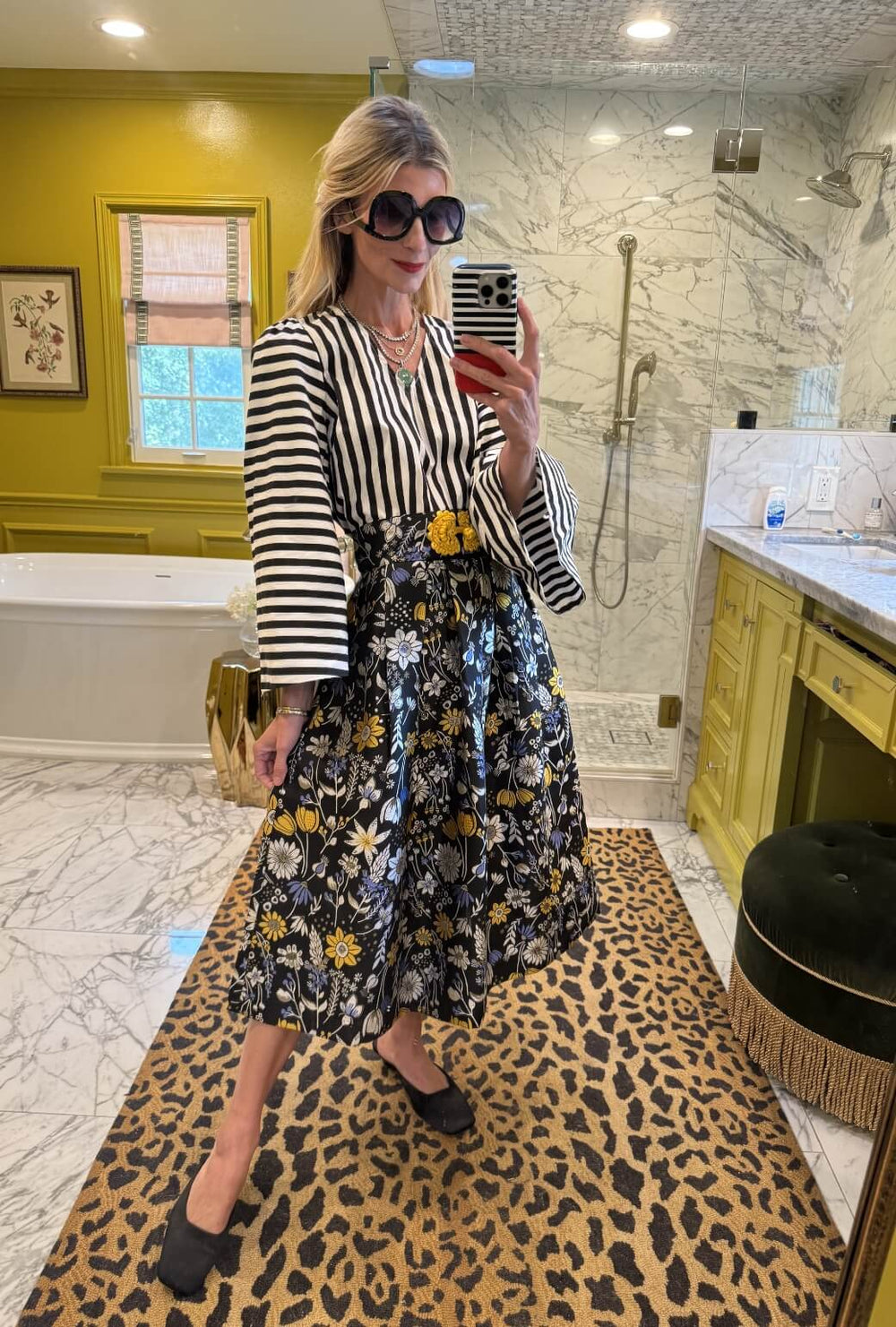 A mastery of mixed prints. The black and white stripe Bell Sleeve V-Neck Top pairs perfectly with the brocade floral print of the skirt. Here we've added the belt of the Priscilla Dress for flair but you can add your favorite belt to finish this off.